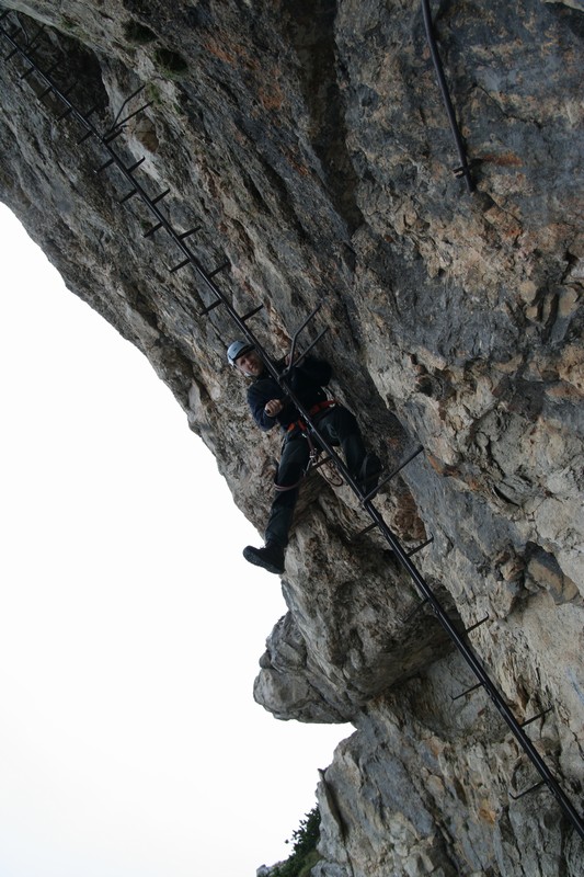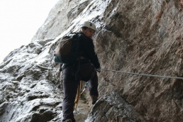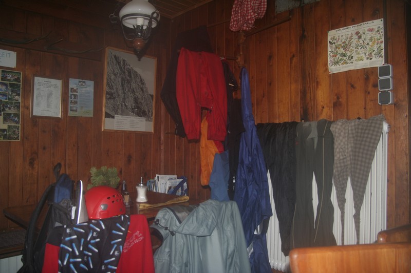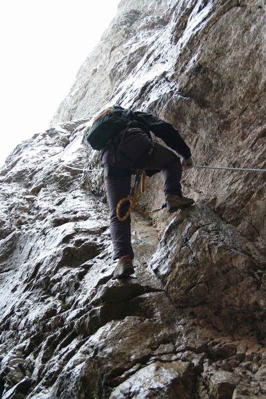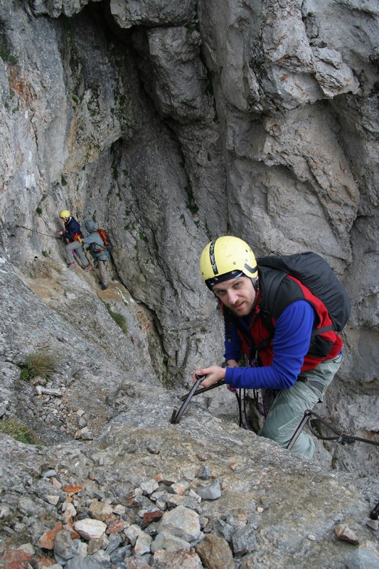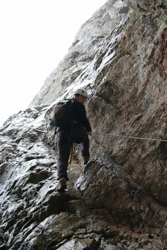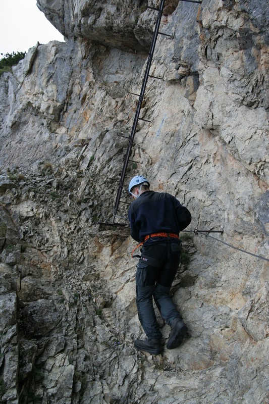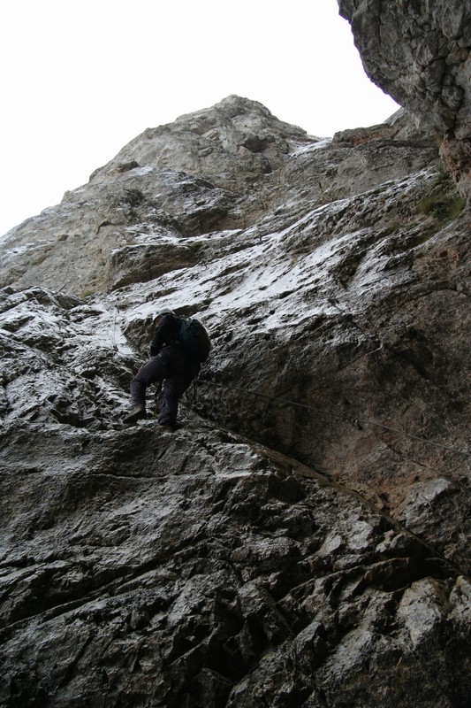 Záverečná bodka po splave nedala na seba dlho čakať. Sobotným predsavzatím sa opäť stal Rax Alpen. Vojťas už v piatok z Rakúska hlásil pomerne pekné počasie. Rozhodol sa, že prespí na mieste a ráno sa k nemu pridáme. Zraz bol u Komanda. Vyrazili sme o 7:30 v sobotu Alenka, Zdenka, Komando a ja. Po ceste v Rusovciach k nám prisadol Martin, bývalý dizajnér TrekSportu. Približujúc sa k parkovisku, na čelnom skle pribúdali dažďové kvapky. Vojťasova ranná SMS o večernej bezoblačnej oblohe plnej hviezd vyznievala tragikomicky. Púšťame stierače. Na parkovisku okrem Vojťasa prespali ďalší odvážlivci, prevažne z Čiech. Posledné uľavenie si v udržiavanom sociálnom zariadení a balíme. Presúvame sa autami na miesto nástupu. Cesta je mokrá, viditeľnosť do 100 metrov. Malé parkovisko, zastrčené tesne pod horou nie je preplnené. Čakáme, kým dážď zoslabne. Dlhú chvíľu si krátime pojedaním prinesených potravinových zásob. Zamýšľame sa, či to má vôbec význam štverať sa po mokrej skale a ešte k tomu za dažďa. Minule sme rovnaký výstup absolvovali za trvalého sneženia a pod bodom mrazu. Dážď by mal byť o niečo príjemnejší. No nič, vyrazíme a uvidíme. Nezobrať si pršiplášť bola hádam najväčšia chyba, ktorej som sa spolu so Zdenkou dopustil. Nástup pod skalu trval hodinu aj čosi. Upevnili sme si sedáky, feratové sety a vyrazili do steny. Hoci jemne pršalo, stále to bolo lepšie ako v zime. Skala a oceľové laná neboli namrazené, no lezenie aj tak vyžadovalo sústredenie. V polovici stúpania začal fúkať silný vietor. V povetrí poletovali zmrznuté krúpy. Neostalo nič iné, len sa posilniť dobre vychladeným pivom. Fotím zriedkavo. Predná šošovka pri zložení krytu objektívu okamžite namokne. Posledná tretina stúpania viedla náveternou stranou svahu. Snáď všetky prírodné živly sa v tej chvíli spolčili proti nám. Vzdorujeme a napokon úspešne zdolávame vrchol hory. Komando s Alenkou pokračujú pár sto metrov k vrcholu, ostatní, čo sme tu už boli, zostupujeme do neďalekej chaty. Nie že by v nej nekúrili, ale pootvorené dvere spravili svoje. Objednávame polievky, sladkosti a sušíme do nitky premočené veci. Za silného vetra opúšťame chatu. Po strmom suťovom svahu zostupujeme nadol. Vojťasovi to nedá a v teréne hľadá nástup na druhú feratu. Našťastie sa mu na ňu nepodarí presvedčiť ani jedného z nás, a tak sa ešte za svetla môžeme dostať domov. René