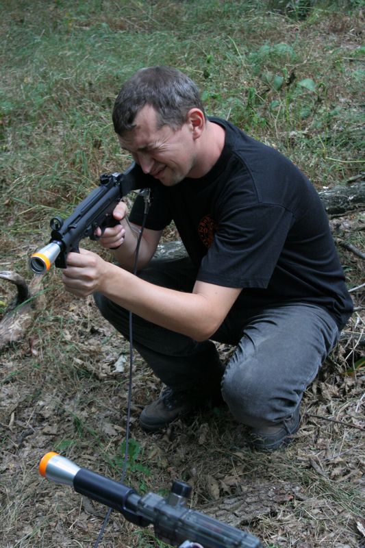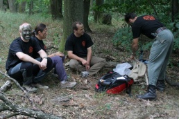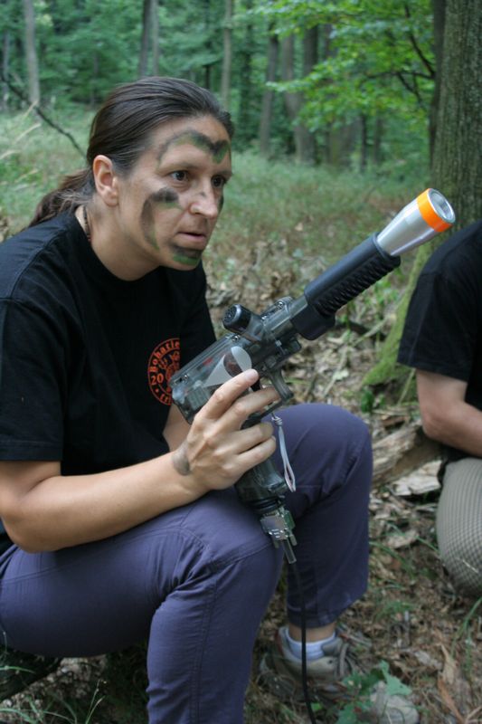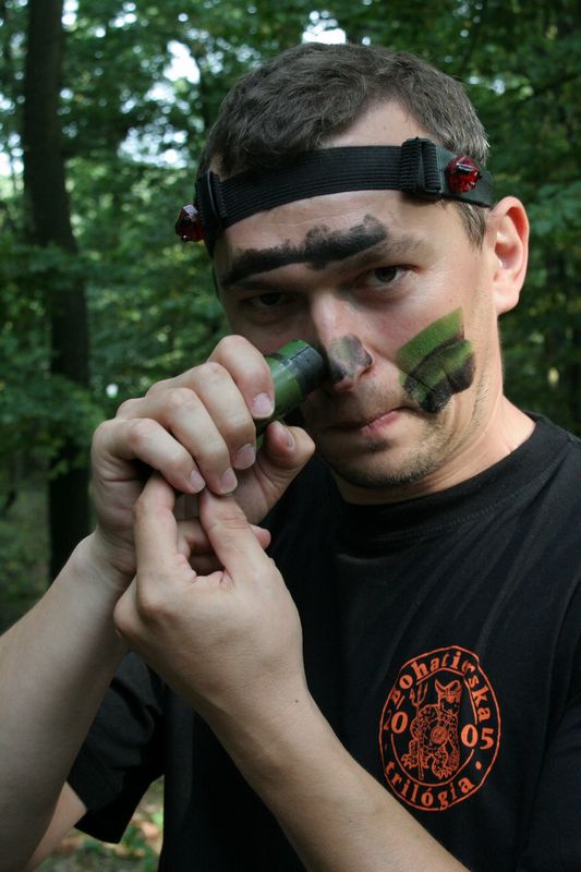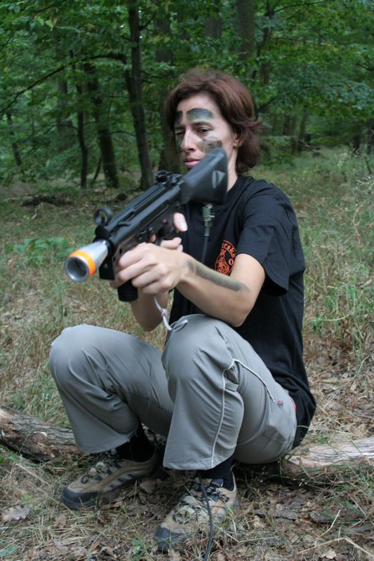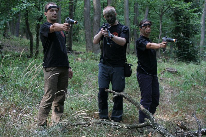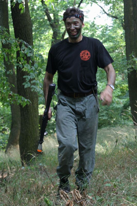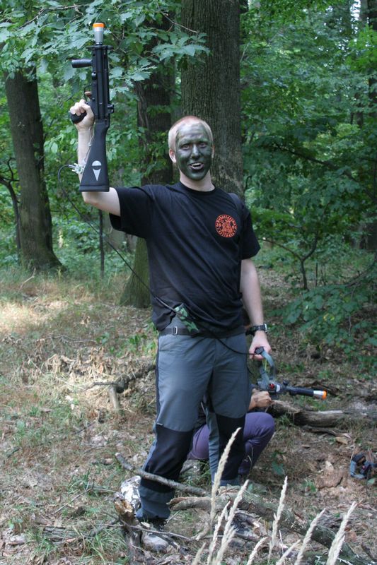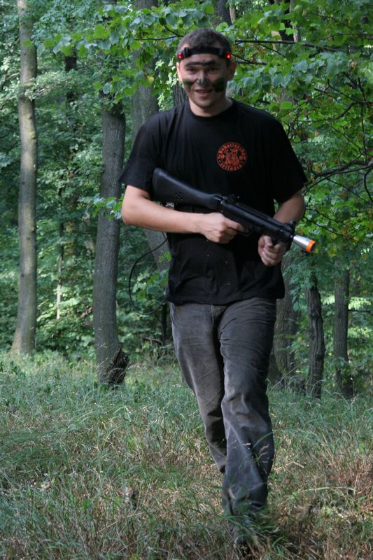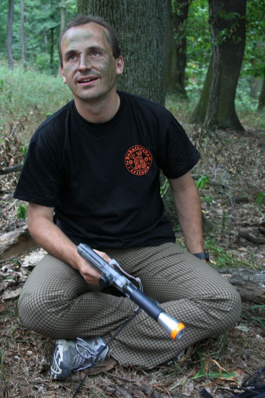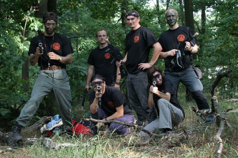 Komandov mail o plánovanej tajnej víkendovej akcii vzbudil pozornosť v nejednom z nás. Okrem potvrdenej účasti na 16:00 od nás vyžadoval, aby sme prišli najlepšie v maskáčových nohaviciach a v čiernom bohatierskom tričku z roku 2005. Hádam zvedavosť z chystaného prekvapenia nás priviedli pod úpätie hory v Bratislave - Rači. Postupne sme sa pozbierali piati bohatieri. Zatiaľ čo sme čakali na Emila, na naše tváre pribudli viditeľné pásy vojenskej maskovacej kaki farby. Dokonale zamaskovaní sme sa presunuli do lesa. Zakrátko sme sa ocitli vo vyhradenom kruhu z napílených konárov. Komando predniesol krátky príhovor a oboznámil nás s princípom hry. Jedná sa o hru podobnú paint-ballu, akurát táto využíva infračervený lúč ako strelivo a terčom sú senzory, umiestnené na hlavách súperov. Každý má 3 životy, 3 zásobníky po 30 nábojov. Stav je zobrazený na displeji zbrane. O zásahu je informovaný hlasom z reproduktora zbrane. Keď zasiahne súpera, rozsvietia sa na ňom červené svetielka v senzoroch na hlave. Po treťom smrteľnom zásahu je zbraň vyradená z funkčnosti. Na jej opätovnú aktiváciu je potrebný nabíjací konektor, ktorý nám Komando na začiatku hry samozrejme zobral. Stihli sme si zahrať tri kolá po 15 minút. Prvé dve boli individuálne na princípe „každý proti každému", to posledné bolo tímové po troch hráčoch. Vyhral ten tím, ktorého aspoň jeden člen útok zákerných maskovaných nepriateľov prežil. Pomaly sa zbiehali rodinní príslušníci s deťmi. Ostatne v nich sme pri príchode vzbudili panický strach, zdesenie, no i slzy v očiach. Nepomohlo ani ubezpečovanie Emila so zbraňou v ruke, že sa jedná len o takú hračku. Na moje maskovanie si zvykli až po dlhšom čase, ktorý sme využili na prihotovenie dreva. Ženy medzitým nakrájali špekáčiky, slaninku, zeleninu a mohlo sa opekať. Pohoda pri ohni trvala až do 21:00. Keď sme opúšťali verejné ohnisko, akurát sa rozpršalo, a to urýchlilo naše lúčenie. Nie však na dlho. Máme pred sebou splav Lužnice, tak zatiaľ...René