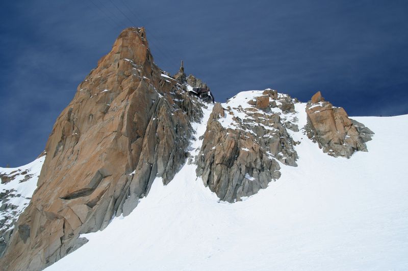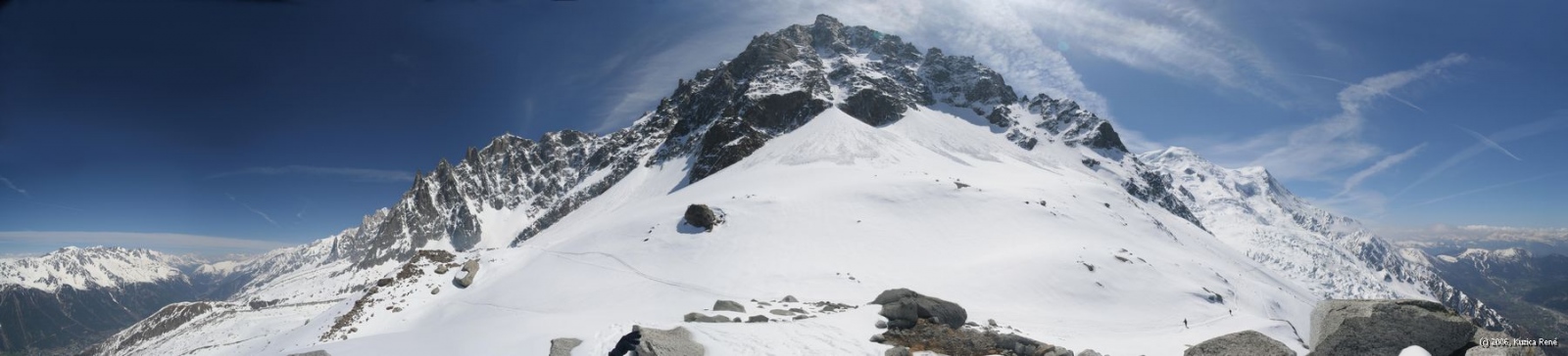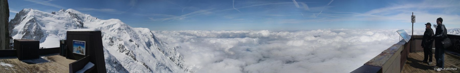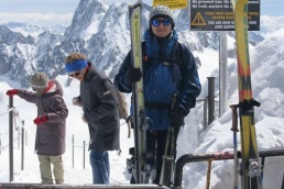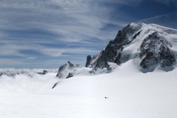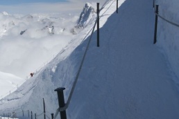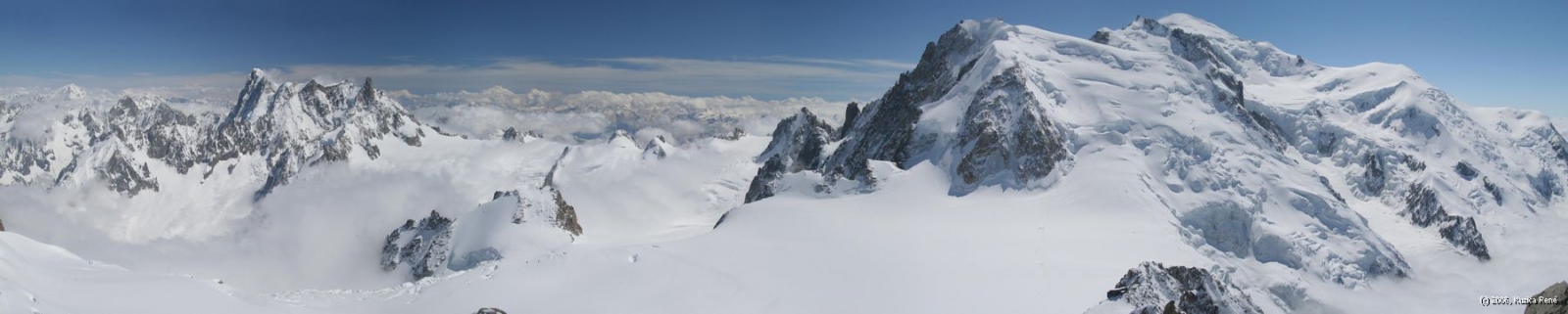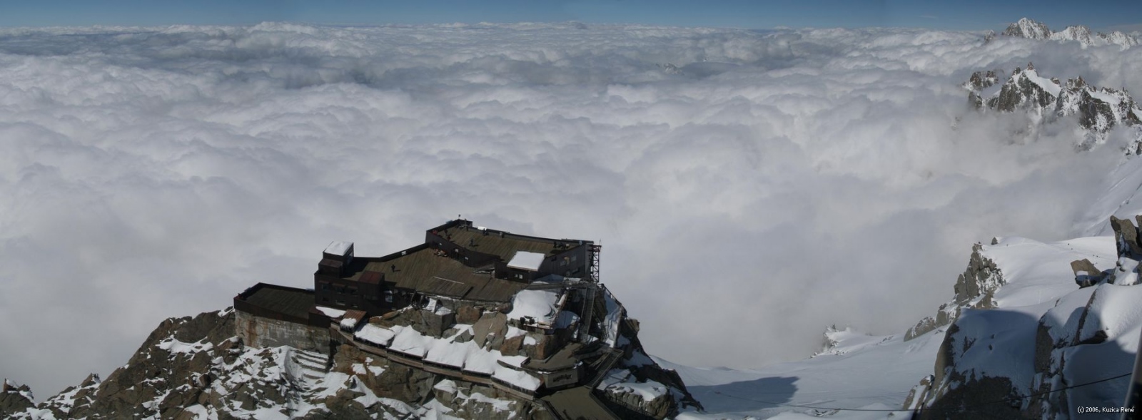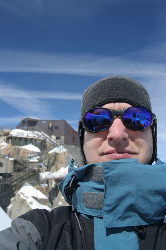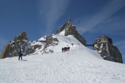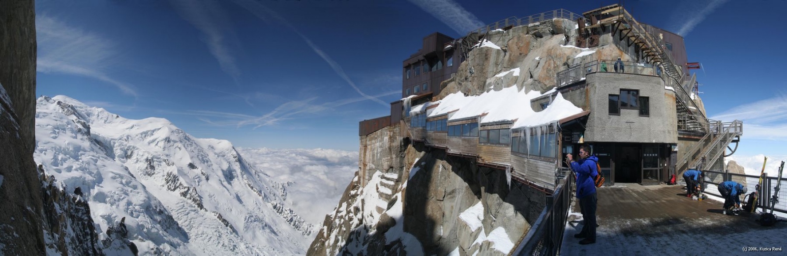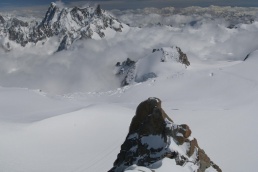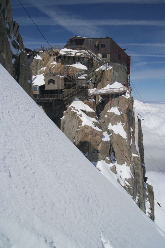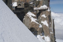 Ranné slnko, pár kilometrov pred našim cieľom, zarezalo svoje ostré lúče do nevyspaných očí vodiča. Stretávame sa s chalanmi pod lanovkou neďaleko turistickej ubytovne. Rýchlo vybaľujeme veci, prezliekame sa a vyrážame na lanovku na Aiguille Du Midi 3842 m.n.m. V prestupovej stanici prechádzame poslednou vrstvou hustých oblakov, nad ktorými vládlo krásne slnečné počasie a plechovo modrá obloha. Na hornú stanicu sme sa dostali v rekordne krátkom čase. Pobyt v týchto výškach, bez predošlej aklimatizácie a spánku, spôsobuje pri kráčaní po schodoch na terasu chaty závrate. Výhľady na masív a okolité horstvo je prenádherné. Mostom sa dostávame do druhého skalného výbežku, odkiaľ je nástup na takmer 17 kilometrov dlhú zjazdovku. Po zlyžovaní prvého svahu a nespočetných pádoch som sa vážne zamyslel. Moje požičané skialpové lyže a nulové zjazdové skúsenosti s nimi sa ukázali byť neprekonateľnou prekážkou a radšej ako nekontrolovaný pád do ľadovcovej trhliny volím ústup smerom na vrchol. Ostatní pokračujú v zjazde, zatiaľ čo ja stúpam s lyžami na batohu a vychutnávam si vysokohorský pobyt. Zišli sme sa pred ubytovňou okolo piatej poobede. Všetci trpíme nedostatkom spánku, no keďže chalanov čaká náročný výstup na vrchol, venujú baleniu podstatne viac času. V tej výške cítiť každý nepotrebný gram. Zdenka zaspala vo vedľajšej izbe a vôbec nereaguje na búchanie Mária na dvere. No čo, pobalí sa až ráno.