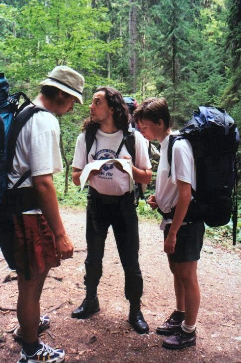 L: vždy je napínavejšie ísť opačne ako ostatní… R: chodíme kade-tade L: a to ešte asi nie je ten okamih, keď zblúdime… R: druhý obed na chate L: aký druhý obed? R: odložené batohy v lese L: to aby sme ich nemuseli niesť na ceste za druhým obedom… R: Glacká cesta – stratená červená značka L: zblúdili sme, nemyslím duševnú stránku, lebo to už dávno, ale normálne keď je tma v lese a človek už nevidí na značky, tak zablúdi ako my… R: zakladáme oheň, spievame, pijeme L: až do spráskania… škoda len, že na druhý deň sme museli najprv dve hodiny neumytí šlapať, kým sme dorazili k vode… No ešte k tomu pitiu, keď človek večer šlape popri potoku a nie vždy sa mu úspešne podarí ho preskočiť na miestach, kde je to nutné, tak mu tak navlhnú topánky, až to treba nejako vykompenzovať… R: Komandov stan v hore L: Komandov brácho mal stan, čím mal postarané o nocľah vyššej kategórie… to my ostatní sme sa museli uspokojiť s igelitom pod karimatkou a pršiplášťom cez spacák… R: v noci sa rozpršalo L: a to pršiplášť moc nepomáhal, ale v niektorých situáciách je to človeku jedno… |