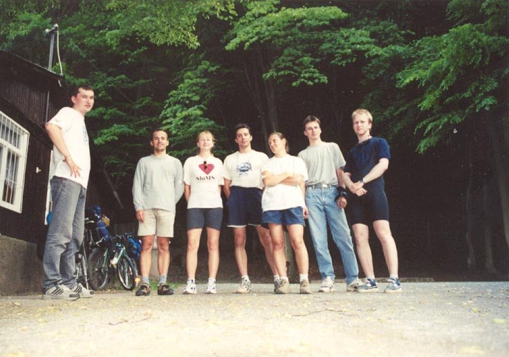 18:35 – Gombasecká jaskyňa. Stretávame tu Dominika a robíme si spoločnú skupinovú fotografiu. Dnes sa totiž pre neodkladné povinnosti odpája Vojťas s Emom, ktorí naspäť pôjdu autom. Neostáva nám nič iné ako vyložiť veci na turistiku z auta a nejako ich pribaliť k ostatným, už teraz ťažkým veciam na bicykli.
