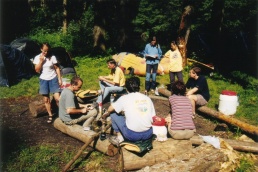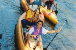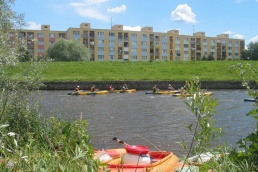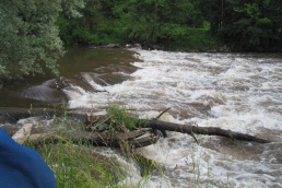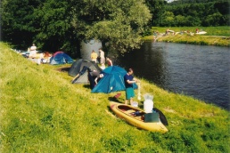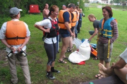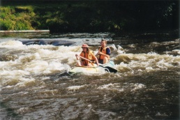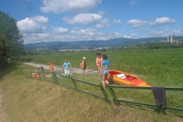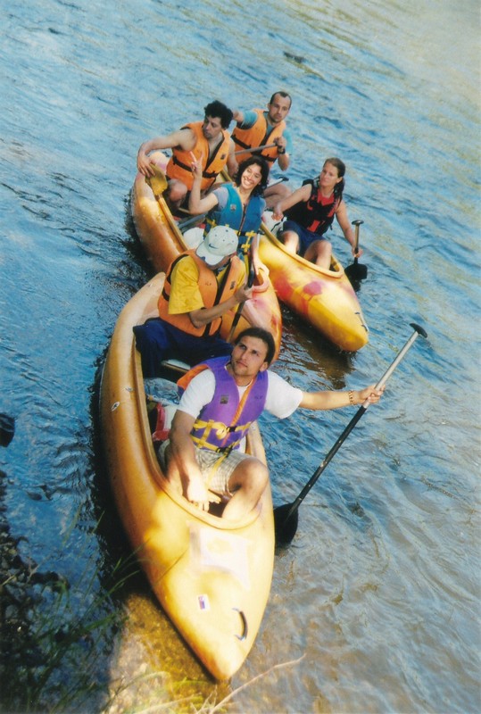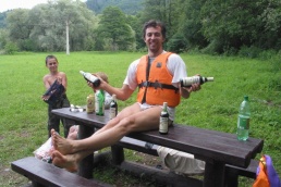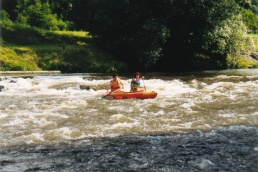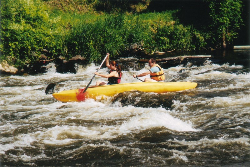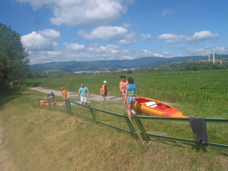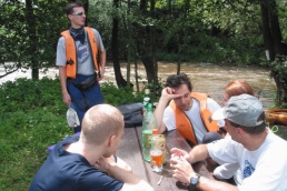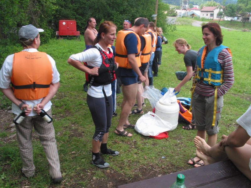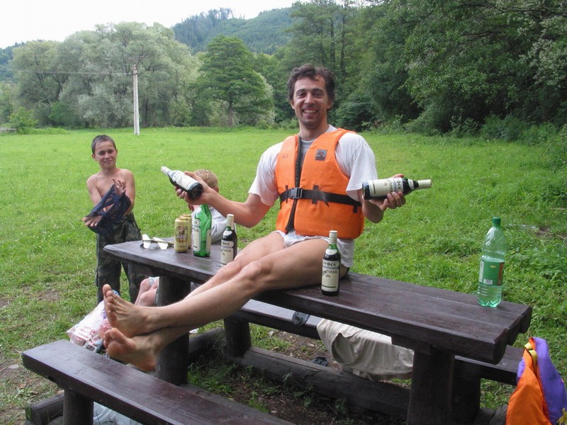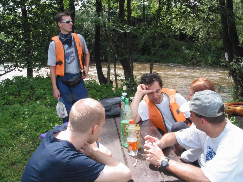 Ráno nás zobudila SMS od Vojťasa – „Vyrážame, skúsime vás dobehnúť.“ Čo?! No to sú blázni. Vojťas s Katkou asi vôbec netušia, že my sme niekoľko sto metrov za nimi. Pokúšal som sa im rýchlo dovolať, ale zbytočne. Ich mobil už bol vypnutý. K hati sa rozbehol Komando a tuším aj Lenka a keď ich zazreli na druhom brehu, začali na nich kričať a mávať. Našťastie si ich všimli. Ostatní sme sa v kľude pobalili a stretli sa pri hati. Ako sme sa ráno dozvedeli, to Zuzkine oko bolo len riadne udreté, stále slzilo a bolo citlivé na svetlo. Po včerajšom dramatickom úseku s dvoma cvaknutiami a prebdenej noci strávenej na pohotovosti už Zuzka nemala náladu na splav a chcela to skončiť v Šalkovej. Dala sa však presvedčiť aspoň po Vlkanovú, hoci vyzerala ako Žižka - s papierovou vreckovkou cez oko a tmavými slnečnými okuliarami. Konečne sa po včerajšom sychravom dni oteplilo a nálada, napriek včerajším zraneniam, bola o to lepšia. Vzájomne sme si pomohli pri prenášaní lodí cez hať a tak rýchlejšie zdolali ďalšiu prekážku bez ujmy na zdraví, rovnako ako neďaleké perejky. Hron sa veselo vinul krajinou až do Vlkanovej, kde to Janči so Zuzkou nadobro skoncovali. Odvoz lode späť do požičovne bol vopred dohodnutý. Tak ahoj! Ináč, pred nami kúpele Sliač a v žalúdku vymetené. Vylodili sme sa, ale márne. V Sliači majú iba tie kúpele, ale žiadnu reštauráciu IV cenovej, otvorené potraviny, večierku ani krčmu s jedlom v okruhu 3 kilometrov. Skúšali sme hlad zahnať v neďalekej cukrárni, ale po krémeši, karamelovej kocke a smotanovo-ovocnej roláde so sladkým kapučínom sa dvíhala nielen hladina cukru. Podľa hesla „Máme chutí na výber“ sme sa presunuli po rieke až do Zvolena. Až teraz som pochopil, k čomu sú dobré hypermarkety, otvorené nonstop a teda aj v sobotu poobede. Grilované kuriatko a opekané zemiaky vo vkusnom mastnom papierovom vrecúšku s umelohmotným príborom chutí vynikajúco. Doplnili sme aj zásoby jedla a pitia na posledný večer a chvíľu sa zdržali na brehu, vystavení obdivu okoloidúceho malomeštiackeho ľudu. Ten nás očumoval aj pri prenášaní lodí cez nekonečne dlhú Zvolenskú hať. Vyčerpaní, s vyťahanými rukami až po kolená, sme nasadli do lodiek a nechali sa unášať prúdom. Už sme sa začali obzerať po vhodnom táborisku. Pár kilometrov pod haťou sme jedno objavili. Pripravené ohnisko a nachystané drevo prilákali našu pozornosť. Netrvalo dlho a na pľaci vyrástlo zopár stanov. Skupina hladných odišla na prieskum okolia za účelom objaviť krčmu a zaujať strategické pozície, druhá skupina ostala strážiť základný tábor. Nečakane sa brutálne rozpršalo. Rýchlo sme poschovávali niekoho vyzuté topánky a rozvešané prepotené veci a iné nechutnosti do stanov, barelov a pod prevrátené lode. Rozžeravená pahreba hádam vydrží nápor vody. Dlhú chvíľu sme si krátili v najväčšom Milanovom stane rodinného typu. Pri fľaši Fernetu sme si ani nevšimli, kedy prestalo pršať. Už dorazili najedení prieskumníci. Ostatní sme si dačo opiekli na ohníku, ktorého plamene plápolali do nočnej oblohy. Predebatovali sa rôzne témy, od konzumného spôsobu života až po ekologický systém Vysokých Tatier a išlo sa spať.
