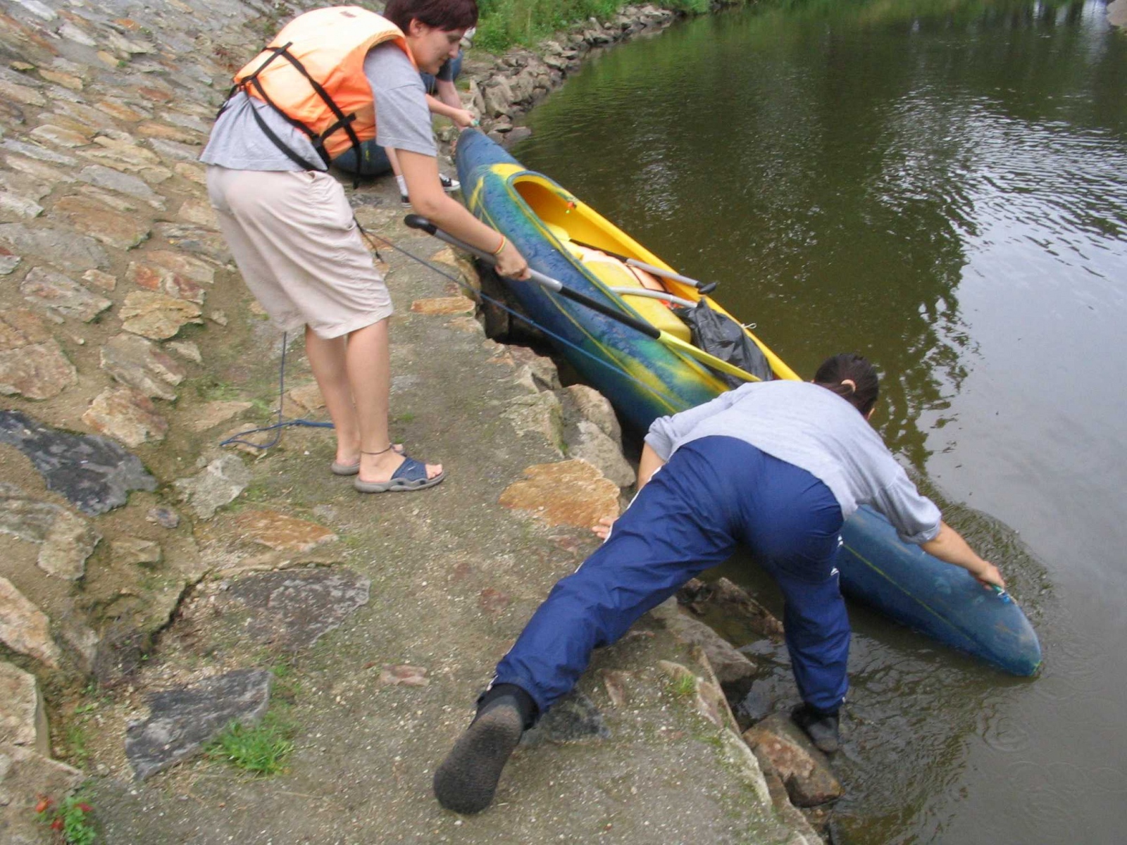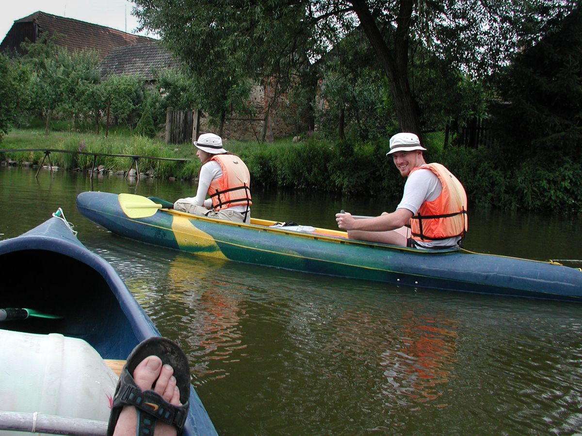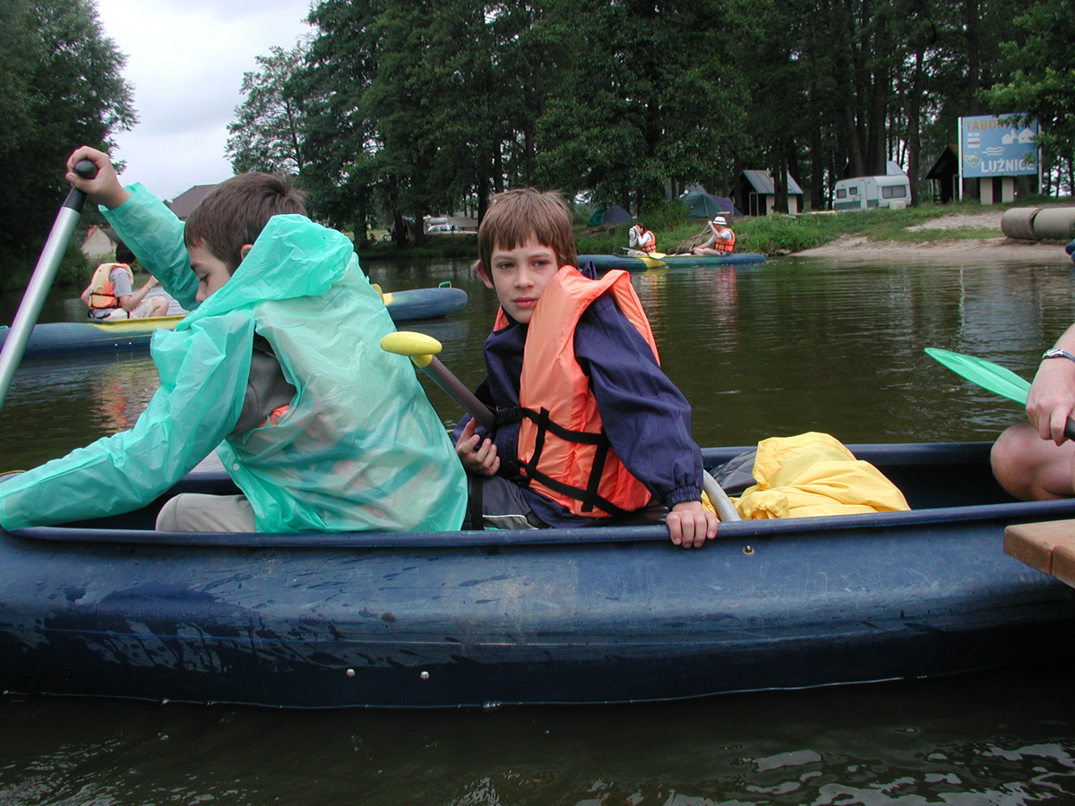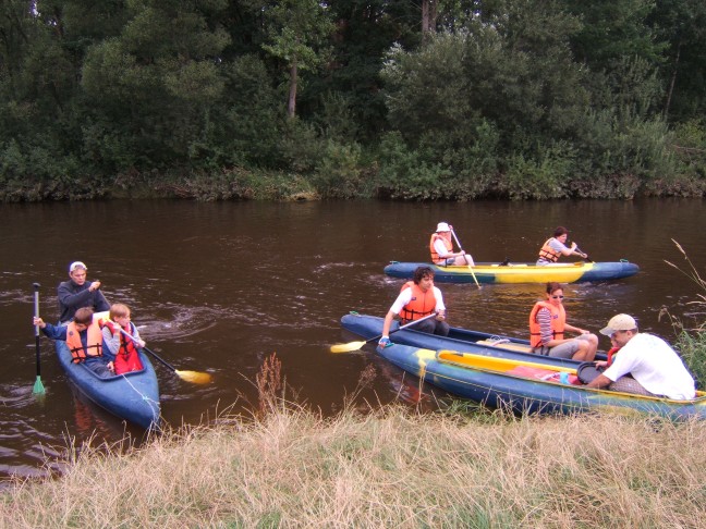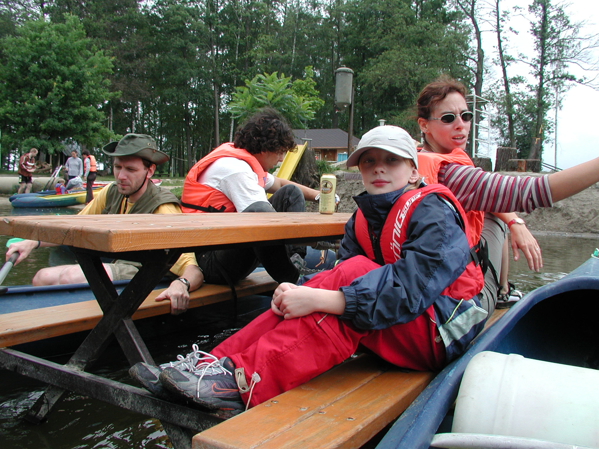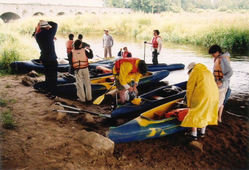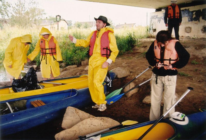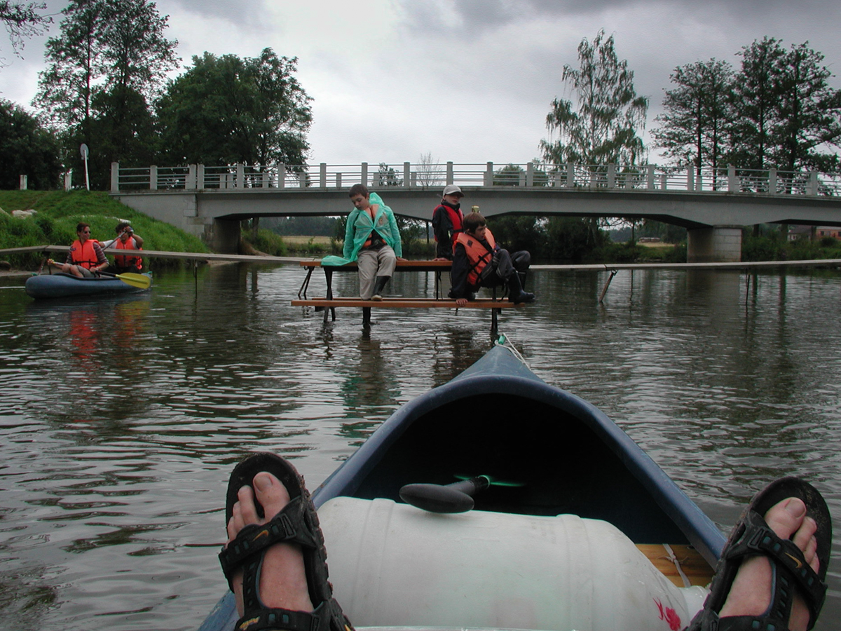 Na svitaní sme našli rieku! Bola pár metrov za bufetom, ale my sme sa včera dostali len po bufet. Ráno o deviatej prišlo z požičovne 7 kánoí typu Vydra, no namiesto 14 barelov na batožinu nám dodali len 8. Zrejme komunikačný šum (ale skôr neschopnosť požičovne) spôsobil toto nepríjemne nedorozumenie. Nedali nám ani náhradné vodácke vrecia, iba akési igelity, svojim tvarom nápadne pripomínajúce vrecia do odpadkových košov. No nič, musíme sa pobaliť tak, aby hlavne spacáky a veci na spanie boli v bareloch, ostatné dáme do našich prinesených igelitových vriec. Netrvali by sme na tých bareloch, keby k nám bolo počasie viac naklonené. Ráno bola zima a zatiahnutá obloha akurát na spadnutie. Všetky zbytočnosti nechávame v autách. O10:00 prišiel posledný prenosový voz (strojvedúci Vojťas, navigátor Helka, prísediaca Elka, ale skôr ležiaca a spiaca). Balenie trvalo až do 11:30, kedy prvá loď sadla na hladinu.