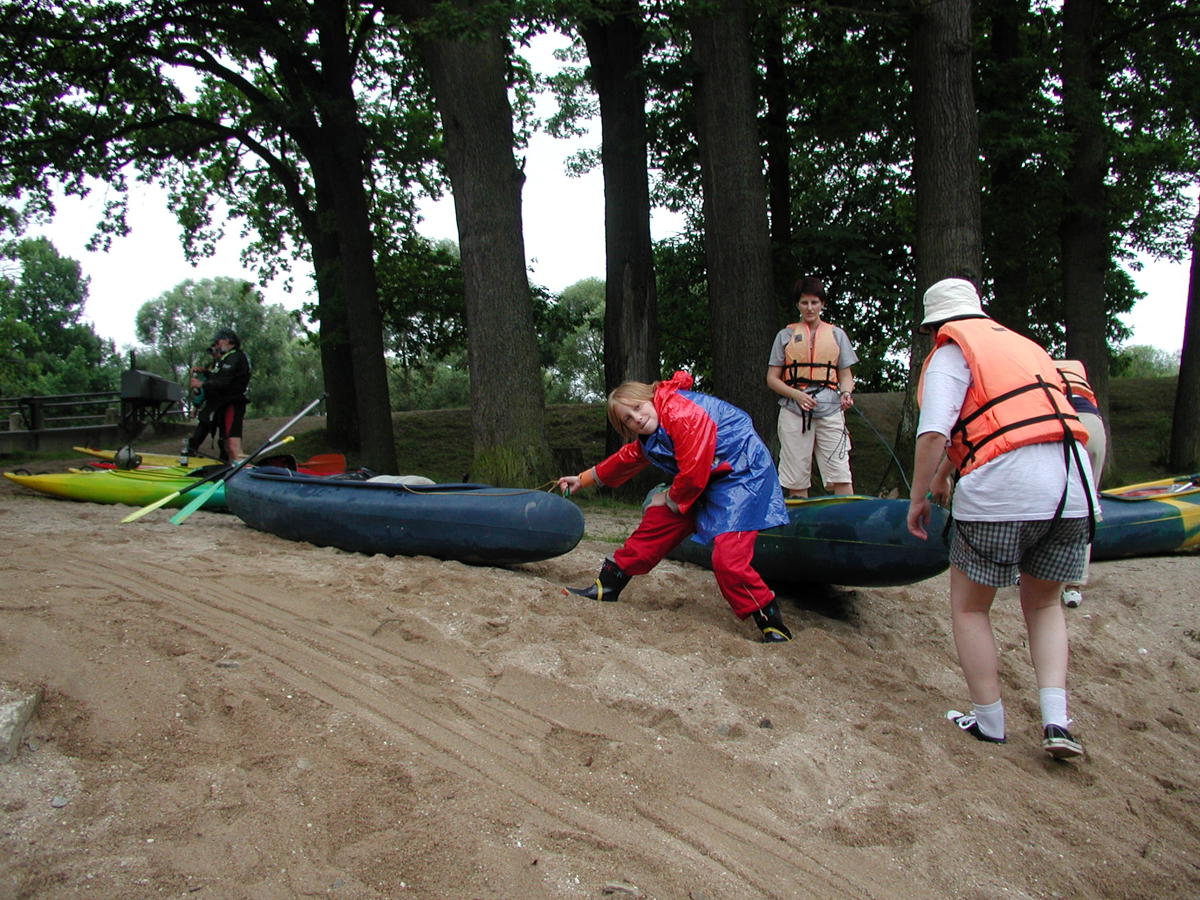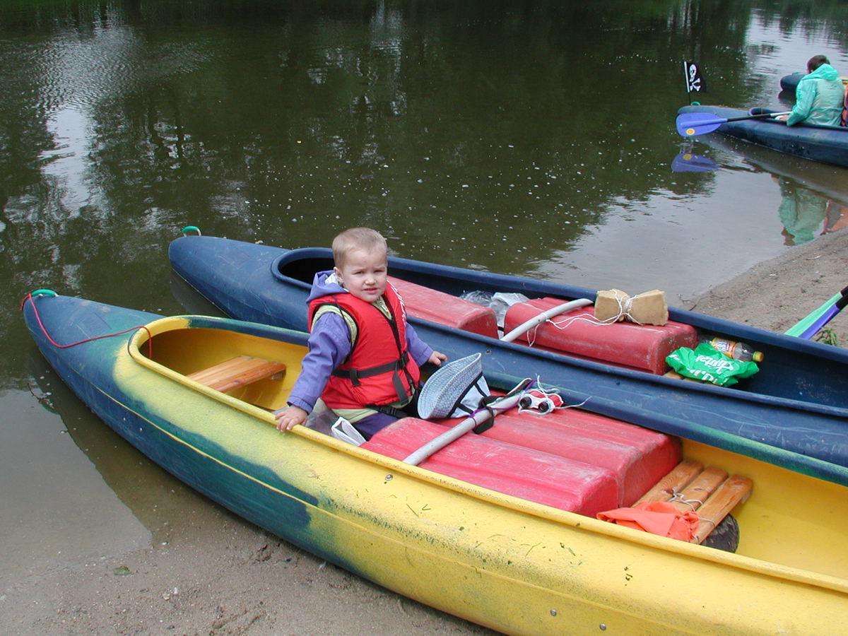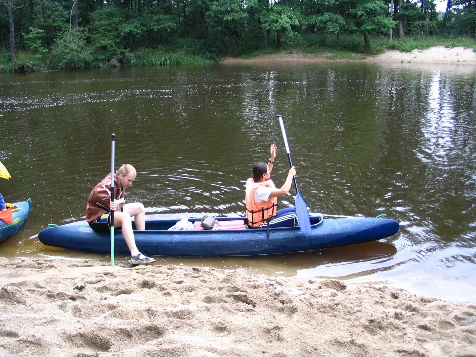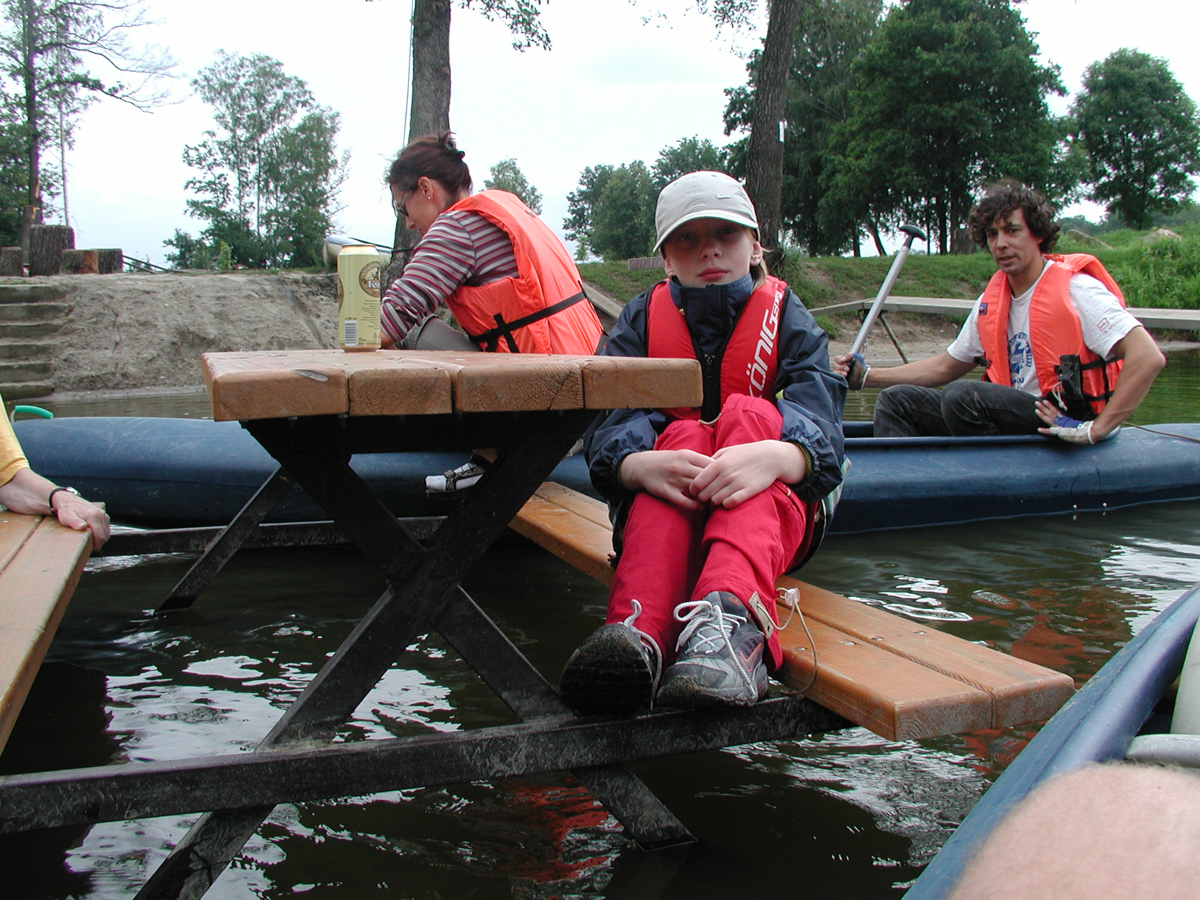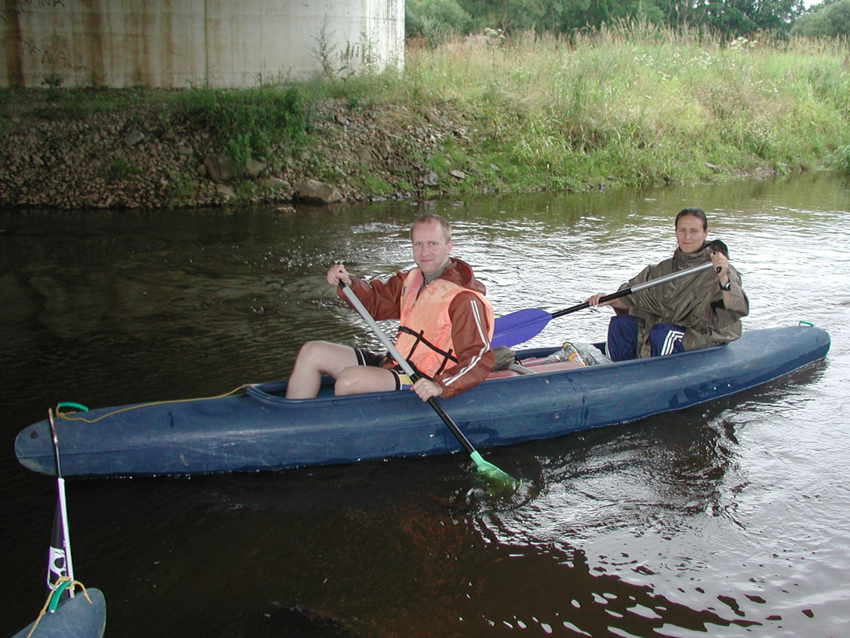 Na svitaní sme našli rieku! Bola pár metrov za bufetom, ale my sme sa včera dostali len po bufet. Ráno o deviatej prišlo z požičovne 7 kánoí typu Vydra, no namiesto 14 barelov na batožinu nám dodali len 8. Zrejme komunikačný šum (ale skôr neschopnosť požičovne) spôsobil toto nepríjemne nedorozumenie. Nedali nám ani náhradné vodácke vrecia, iba akési igelity, svojim tvarom nápadne pripomínajúce vrecia do odpadkových košov. No nič, musíme sa pobaliť tak, aby hlavne spacáky a veci na spanie boli v bareloch, ostatné dáme do našich prinesených igelitových vriec. Netrvali by sme na tých bareloch, keby k nám bolo počasie viac naklonené. Ráno bola zima a zatiahnutá obloha akurát na spadnutie. Všetky zbytočnosti nechávame v autách. O10:00 prišiel posledný prenosový voz (strojvedúci Vojťas, navigátor Helka, prísediaca Elka, ale skôr ležiaca a spiaca). Balenie trvalo až do 11:30, kedy prvá loď sadla na hladinu.