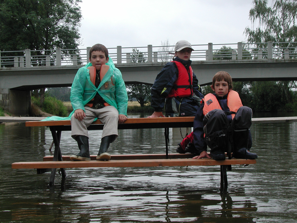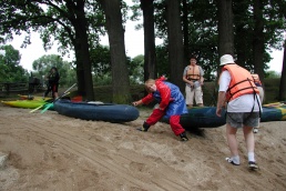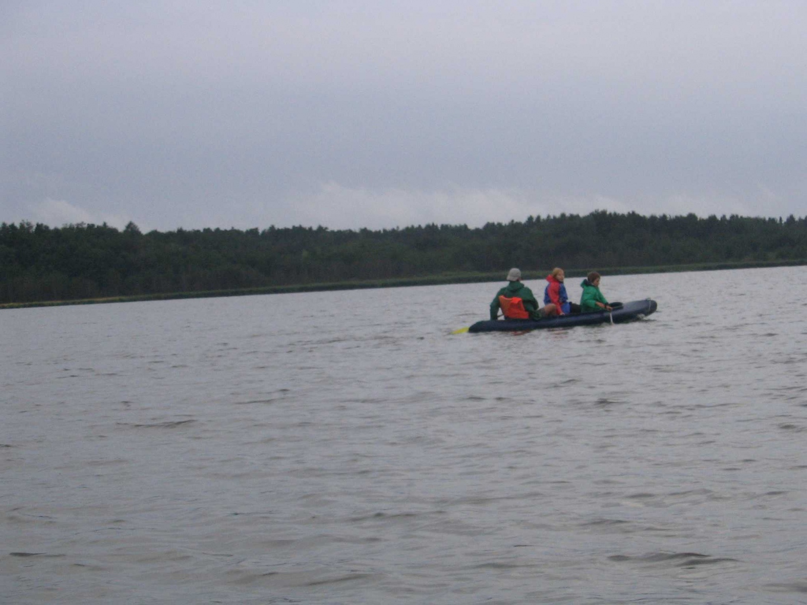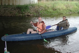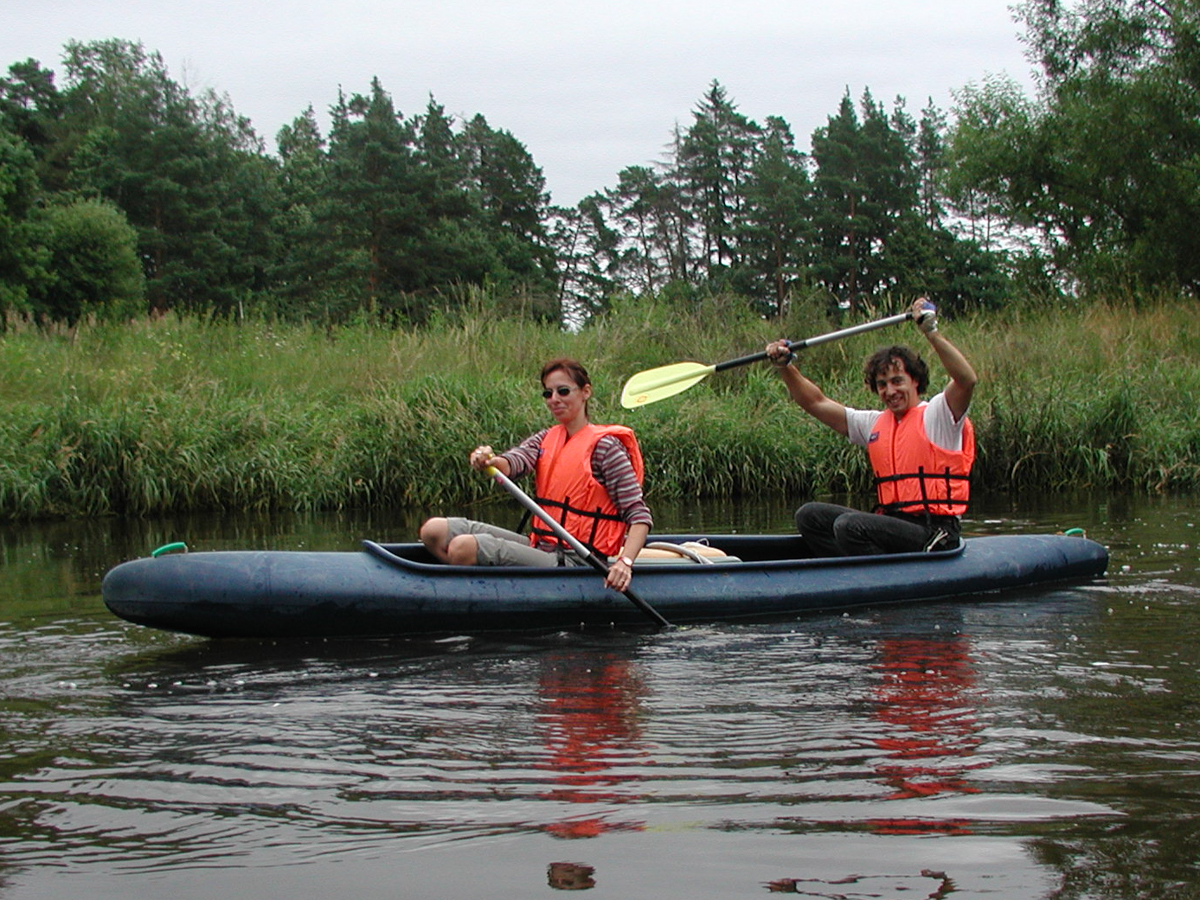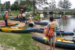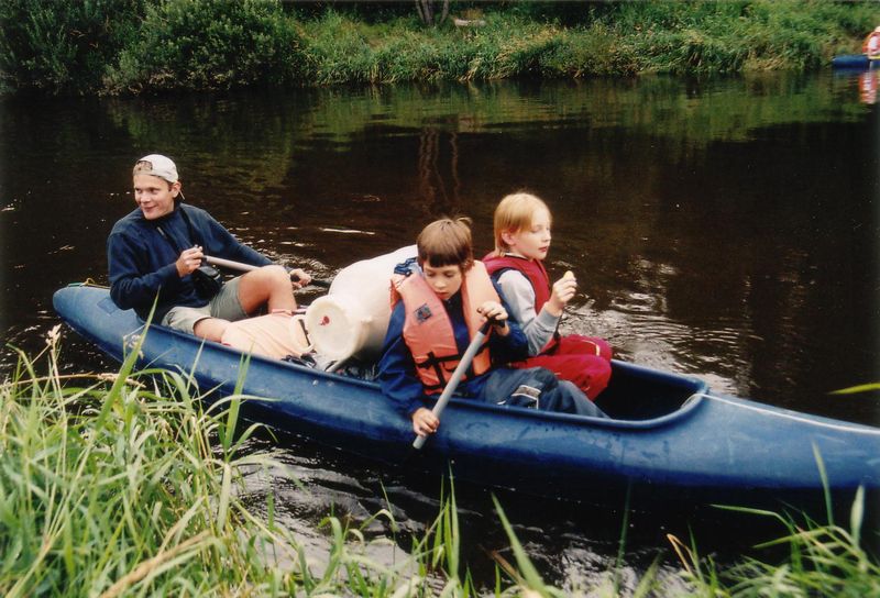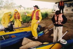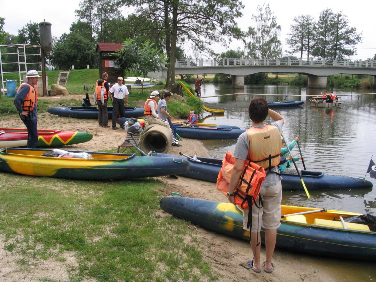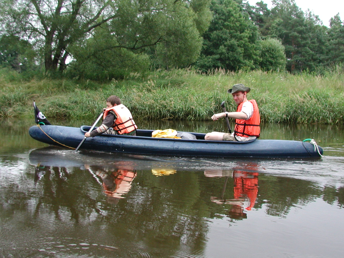 Na svitaní sme našli rieku! Bola pár metrov za bufetom, ale my sme sa včera dostali len po bufet. Ráno o deviatej prišlo z požičovne 7 kánoí typu Vydra, no namiesto 14 barelov na batožinu nám dodali len 8. Zrejme komunikačný šum (ale skôr neschopnosť požičovne) spôsobil toto nepríjemne nedorozumenie. Nedali nám ani náhradné vodácke vrecia, iba akési igelity, svojim tvarom nápadne pripomínajúce vrecia do odpadkových košov. No nič, musíme sa pobaliť tak, aby hlavne spacáky a veci na spanie boli v bareloch, ostatné dáme do našich prinesených igelitových vriec. Netrvali by sme na tých bareloch, keby k nám bolo počasie viac naklonené. Ráno bola zima a zatiahnutá obloha akurát na spadnutie. Všetky zbytočnosti nechávame v autách. O10:00 prišiel posledný prenosový voz (strojvedúci Vojťas, navigátor Helka, prísediaca Elka, ale skôr ležiaca a spiaca). Balenie trvalo až do 11:30, kedy prvá loď sadla na hladinu.