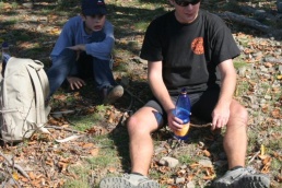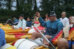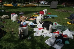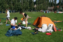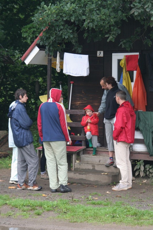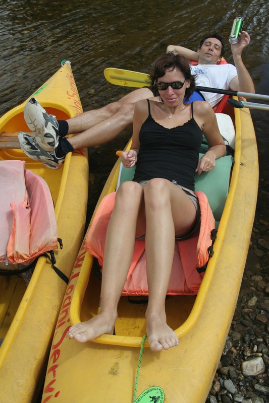 Toto bol deň odchodu, naše spoločné posledné raňajky, karty, a kto prehrá - pije fernet. Posledné sušenie stanov, balenie vecí a čo ako a kedy. No a zrazu sme už ani naše člny nemali. Posledná rozlúčka, bolo nám fajn, a vyrážame. PS: Vojťas si chcel ešte skúsiť splaviť ten kúsok nad Sušicami a Komando s Alenkou neboli proti, tak s Elkou sme si na chvíľočku pospali v aute a vybrali sme sa po našich troch bohatierov do Sušíc k nášmu prvému táborisku.