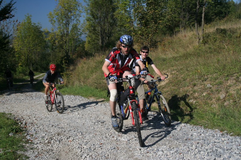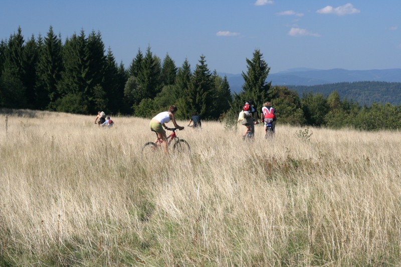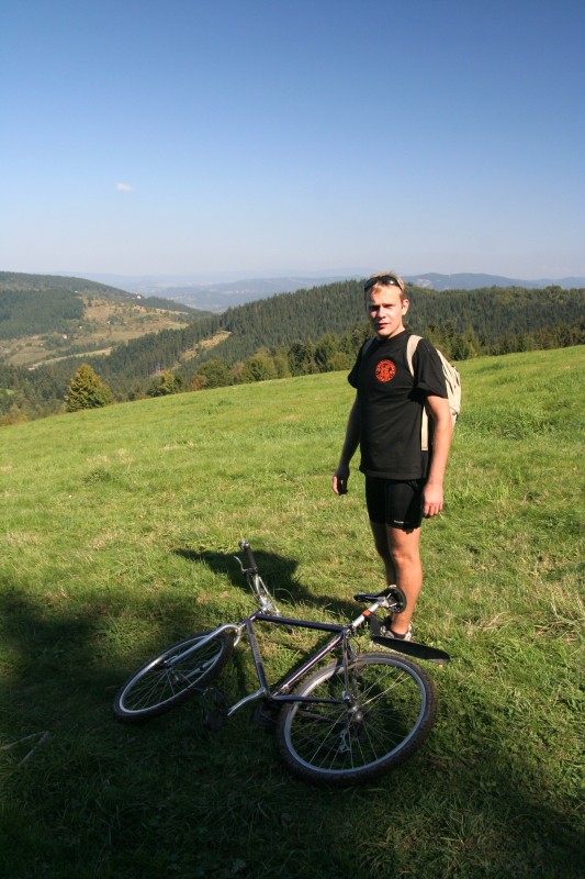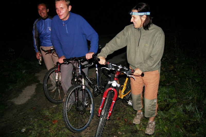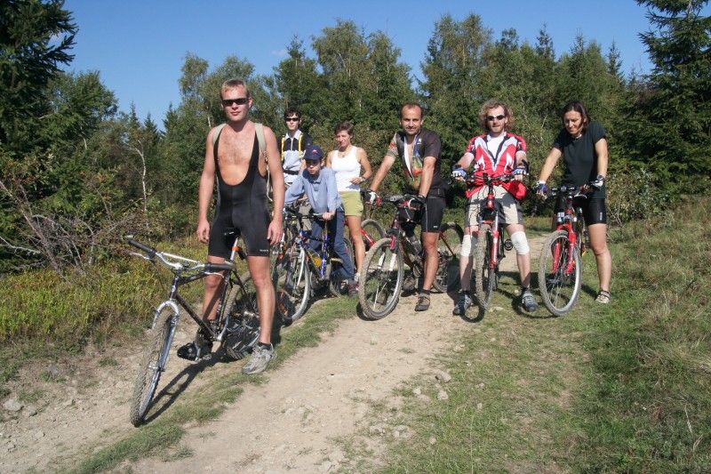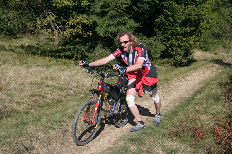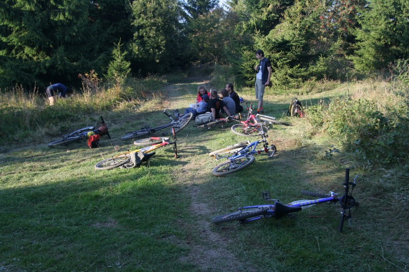Ráno prichystal Tibor vynikajúcu bryndzovú nátierku s čerstvou cibuľkou a Zdenka čaj. Spoločné raňajky si každý dosýta vychutnal, veď nás čakala neznáma trasa a podľa správ z kuloárov sa na nej nepredpokladali žiadne občerstvovacie chaty. Cyklofľaše s iontovými práškami zaplnila po okraj studená voda. Aj lepenie defektu, skladanie bicykla a preskakovanie švihadla patrilo k našej príprave. Prvý downhill od chaty po vertikále sme zvládli. Po ceste sme sa zastavili v najbližších potravinách, kde si každý doplnil zásoby na deň, niektorí aj na dva. Špecialitou boli Anténkine kukuričné chrumky v rodinnom balení, trčiace z ruksaku provianťáka Petríka. Za dedinou začalo prvé stúpanie, a tak si Tibor priviazal Vikiho bicykel gumeným lanom o svoj. Za necelú hodinku sme odstavili tátoše na čistinke s lavičkami. Pitný režim treba dodržiavať za každého počasia. Lesná cestička nás ďalej doviedla na neznačené rázcestie. Už tu sa rýchlejší členovia oddelili od skupiny a nereagovali na výzvu vrátiť sa, pretože boli tak ďaleko, že ju ani nemohli začuť. A tak boli privolaní mobilným telefónom. Terén trasy sa občas zavlnil a veru bolo treba niektoré úseky zosadnúť a poctivo tlačiť. Ďalšia pauza bola na pravé poludnie. Slnko ukázalo svoju letnú tvár. Voda sa rýchlo míňala a čoskoro nebolo čo piť. Situáciu zachraňovala Anténka, ktorá sa s vervou vrhla do hlbokej studne s nízkou hladinou vody, aby nám naplnila fľaše. Ostatní sme zatiaľ ležali v tráve, strážili bicykle a dojedali posledné kúsky kukuričných chrumiek. Čas pokročil a bolo sa treba pobrať. Cesta viedla zarasteným hrebeňom Javorníkov. Šípky na kríkoch dozrievali a lístie žiarilo všetkými farbami. Nezvyknuté zadky trocha omínali, ale sedadlá boli neúprosné. Po náročnom a zároveň poslednom stúpaní sme si na hrebeni spravili pauzu. O 17:00 už slnko čiastočne zapadalo a aj sa trocha zozimilo. V okolí bolo plno dozretých černíc. Zber lesných plodov, spojený s ich okamžitou konzumáciou, patril medzi najkrajšie chvíle dnešnej cyklistiky. Vojťas, v snahe vyťažiť z dňa maximum, sa pobral nabehať ďalšie kilometre po hrebeni, ostatní sme si vychutnali rýchly a pomerne strmý zjazd. Zostup viedol lúkami pomedzi osamelé domčeky a asfaltkou skončil v dedine. Naše spotené a unavené telá rozrážali stojatý studený vzduch v doline. Správne vychladení sme prišli do prvej krčmy a dali správne vychladené pivá, no niektorí rovno horúci čaj s rumom. Nikomu sa z tepla nechcelo, no keďže nás Vojťas nedobehol, pobrali sme sa ku chate. Vertikálna cesta nás aj teraz poriadne zohriala. Keď sme dorazili do cieľa, bolo presne 19:00 hodín. Takmer nikto nezvládol sprchu, a rovno sme prešli ku grilovaniu slaninky, kuracích krídiel a pre labužníkov bol prichystaný losos. Romantickú atmosféru dotvárali horiace sviečky na stole. Volal Vojťas – aby niekto pre neho došiel autom, pretože dostal defekt a už sa mu to v tme a zime nechcelo lepiť. Grilovačka chvíľami pripomínala skôr flambovanie megaplameňom, no losos bol skvelý. Už o pol desiatej bol Vojťas tuhý, postupne sa vytrácali aj ostatní, unavení celodenným šliapaním. Presunuli sme sa k ohňu, kde sme strávili, pod oblohou plnou hviezd, večer plný nezodpovedaných filozofických otázok a niekedy aj odpovedí.