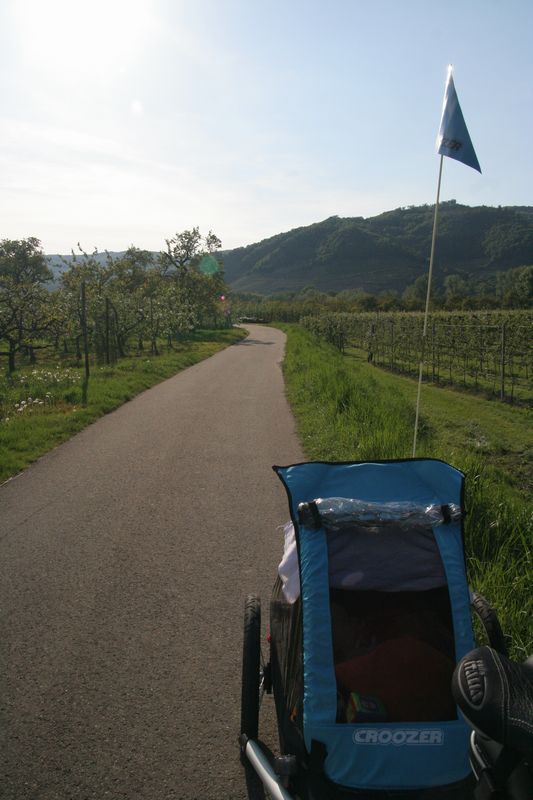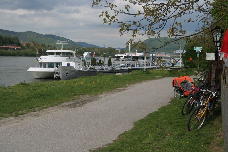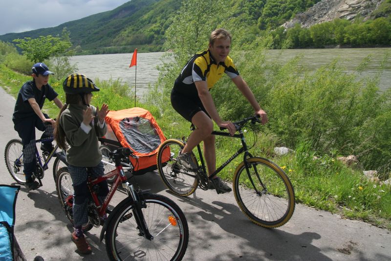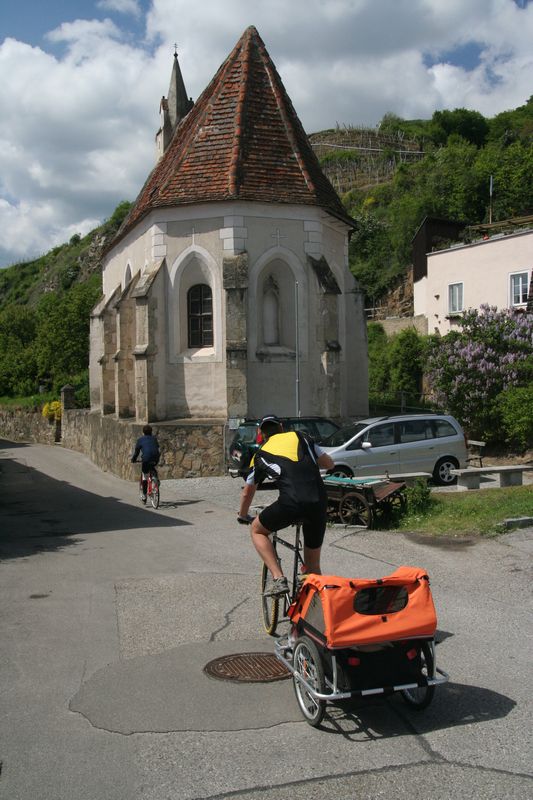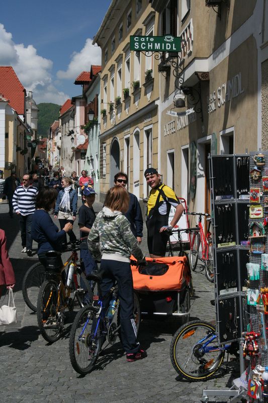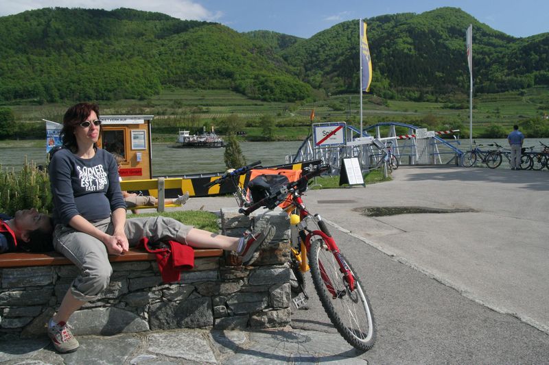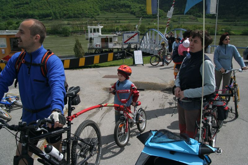 V Melku sme to nateraz zabalili. A to doslovne. Po raňajkách sme naložili komplet batožinu aj s bicyklami a deťmi do áut a presunuli sa do Kremsu. Tentoraz sme okrem bicyklov nič nevybaľovali, takže naše tátoše boli osedlané behom chvíľky a už o pol dvanástej zanechávali prvé virtuálne stopy v asfalte, ohľaduplne nanesenom do kraja kvalitných viníc a rozkvitnutých ovocných sadov. Mestečko Dürnstein vítalo pustovníkov otvorenými pivničkami a obchodíkmi so suvenírami. Neodolali sme a zastavili sa hneď pri prvej pivničke. Správne vychladené zlatisté vínko, v tenkostenných pohárikoch na vysokej stopke, prepúšťalo slnečné lúče skrz seba a na jemných bublinkových vláskoch ich rozptyľovalo do okolia. To sa nedá nechľastať. Posnorili sme úzkymi uličkami, nedočkavé detváky sa vymočili podľa potreby kde sa len dalo, a z vysunutých hradieb na opačnom konci mesta sme pozreli meandre Dunaja. Po vínku poriadne vytrávilo a tak najbližší cieľ dostával jasné kontúry. Otvorená reštaurácia na ľavom brehu, s hojdačkami pre najmenších, bola naplnená až po okraj, no veľa bohatierov sa všade dobre zmestí. Po zaprataní ženských brušiek a mužských kotlíkov dobrotami pokračovala cesta ku kompe v Spitze, kde sme včera stratili Emu, no tentoraz sme si všetci dali poriadneho majzla. O štvrtej sme sa prepravili na pravý breh a pokračovali späť do Kremsu. Cesta viedla vinicami a okolo detských ihrísk. Bohatieri jedno z nich takmer zlikvidovali, keď ho poctili svojou návštevou. Posledné kilometre putovania sme zápasili so silnejúcim protivetrom, ktorý spôsobil oddialenie príchodu k autám. O siedmej večer sme naložili bicykle a vydali sa každý svojou cestou.
