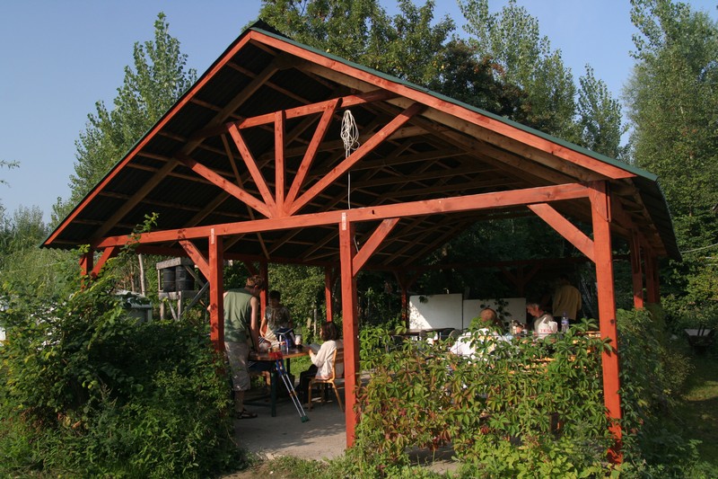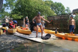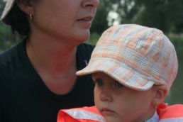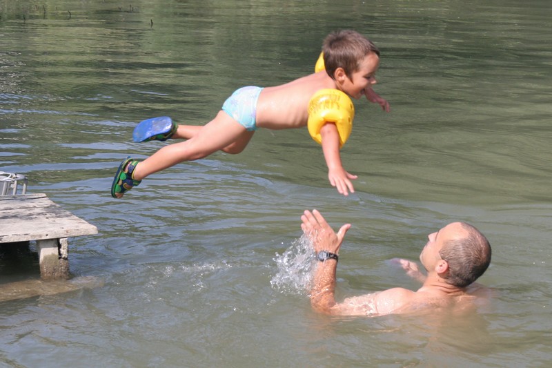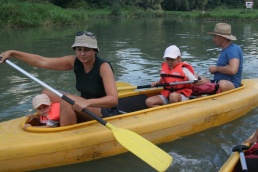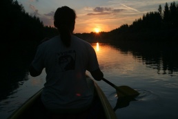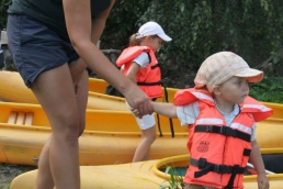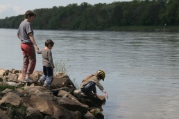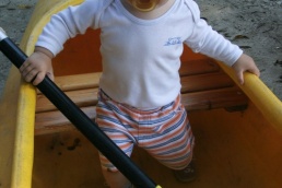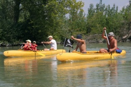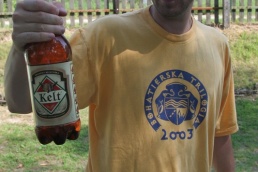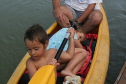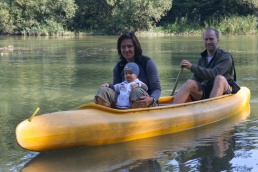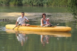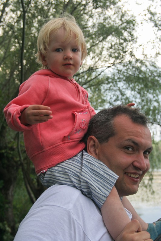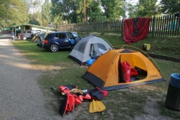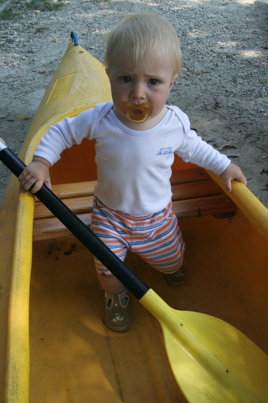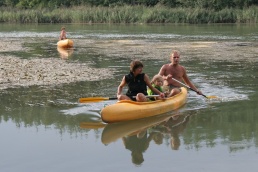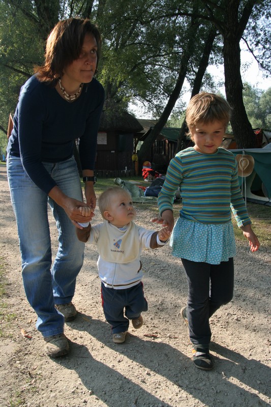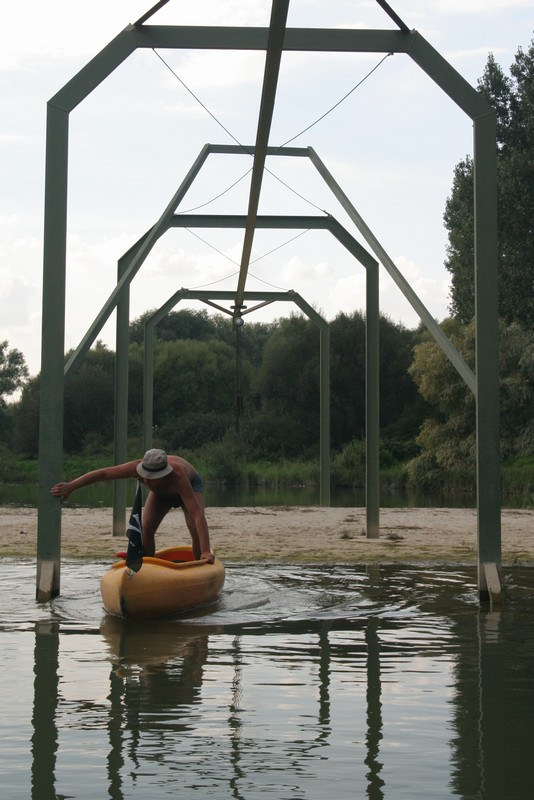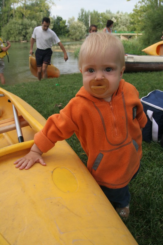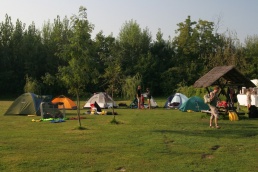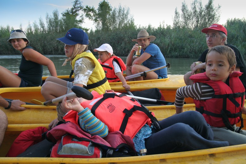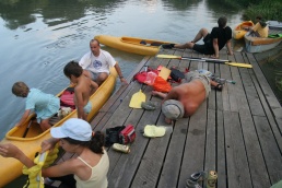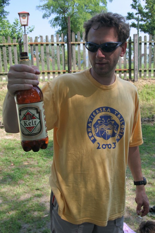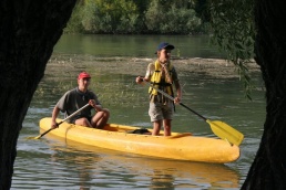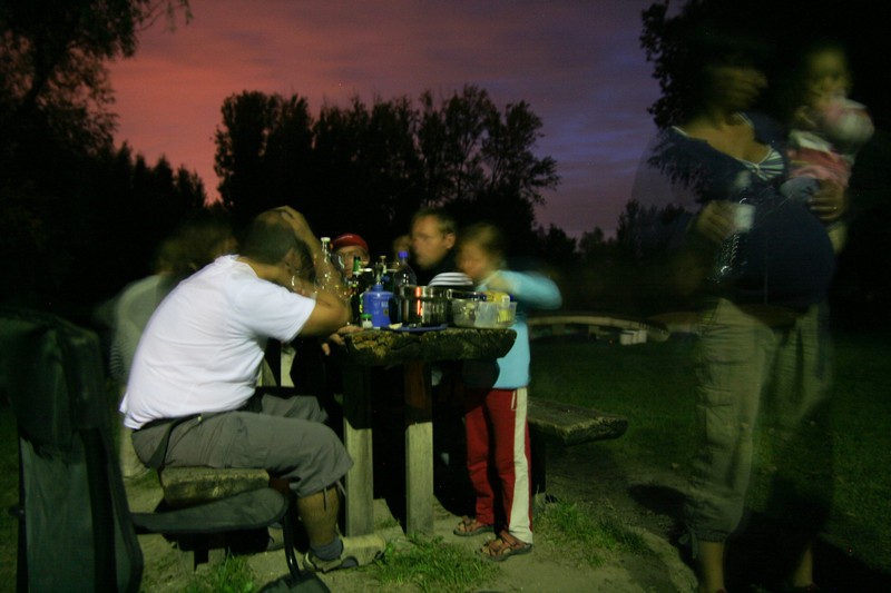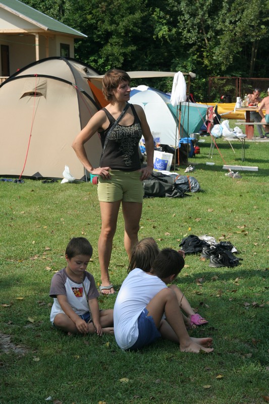 O pol deviatej sme zbalili veci, autá nechali na parkovisku pred kempom a vyrazili sme. No, aj by sme vyrazili hneď po zbalení, ale požičovňa lodí nie a nie sa dostaviť. Našťastie Yanoov Kelt bol, je a čoskoro by nebol. Čakanie sme si skrátili popíjaním tohto teplého moku. Decká nevedeli čo od dobroty či zloty, a lode nikde na obzore. Pár minút po obede konečne dorazili. Za meškanie sa borec z požičovne ospravedlnil a dal aspoň prepravu lodí zadarmo. O trištvrte na jednu zaborila žltú špicu do vody prvá kánojka a za ňou nasledovali ďalšie. Pokojný dvojhodinový úsek čoskoro ukončil hlad a smäd. Odskočili sme si do neďalekej reštaurácie, kde už čakala Zdenka s nesplavníkom Riškom. Po výdatnom obede a pive sme pozvoľna začali nasadať do lodiek. Zvýšený výskyt maloletých bohatierov čiastočne časovo skomplikoval nalodenie, no do polhodiny sa všetci odrazili od dreveného brehu a pokračovali v pádlovaní a prekonávaní prekážok ako na vode, tak i na súši. Pohodu na vode dotvorili lúče zapadajúceho slnka, odrážajúce sa od pokojnej hladiny Dunaja. O ôsmej večer sme zakotvili v malebnom kempe s pokosenou lúkou pre stanový tábor a jednou chatkou pre našich najmenších bohatierov. Po zotmení nám roje nepríjemných komárov dýchali na opálené krky a cicali krv, takže stavba stanov trvala rádovo minúty.