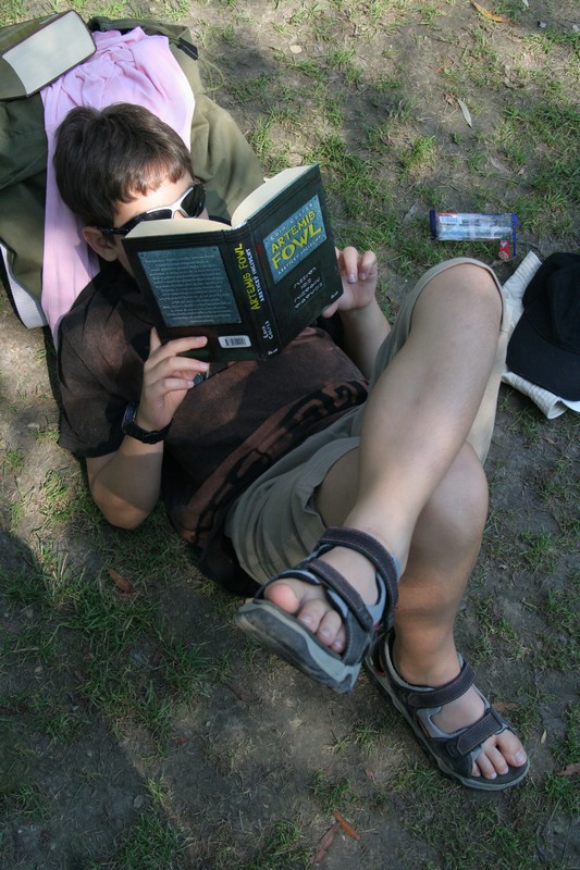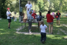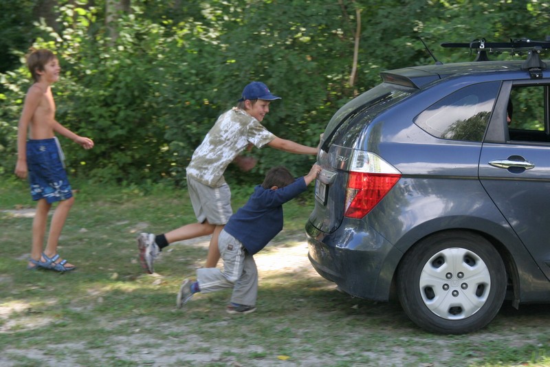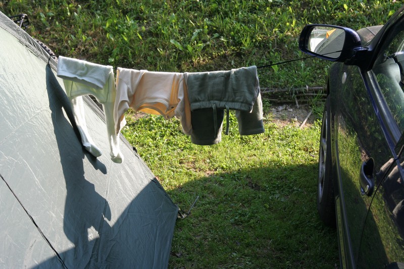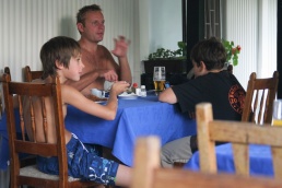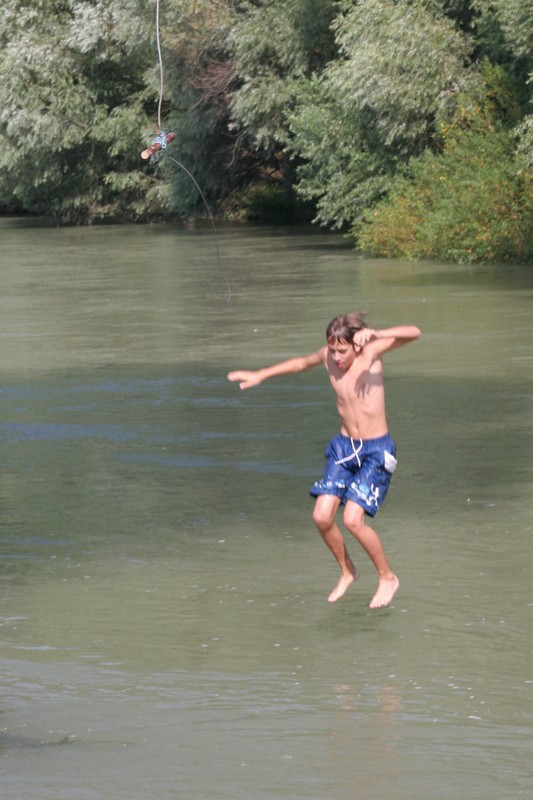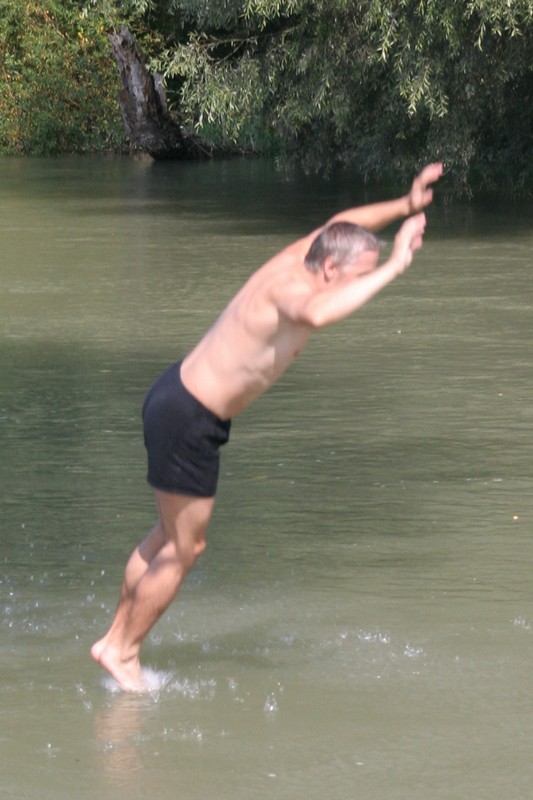 Niečo po ôsmej bohatiersky tábor vstal a do ranného ticha spustil svoj džavot. Pod vonkajší spoločenský prístrešok priniesla majiteľka veľký plechový hrniec plný presladeného čaju. O jeho „osviežujúcich“ schopnostiach počas úporného letného dňa nebolo pochýb. Choroba si vybrala prvú detskú obeť, a tak to polovica posádky Derkovcov zabalila. Ostatní si krátili chvíle čakania na môj návrat z potravín s nakázaným proviantom rôznymi zábavkami, napríklad skákaním do vody z visutého lana a menší bohatieri skokmi z móla. Tibor, Boris a Vojťas išli všetkým príkladom, a ak by sa plnil bobrík odvahy či umeleckého prejavu, každý by získal obidvoch. Keď sa všetci nalodili, ja som pokračoval na bicykli so zapojeným prívesom popri brehu. Ku večeru prišli na verejné táborisko, ktoré sa dočasne stalo našim domovom, aj ďalší bohatieri Komandovci a Vargovci, ktorí symbolicky doplnili znížené stavy a splavili si aspoň kus dunajského ramena. Nič už nebránilo spoločnej opekačke, ktorá sa pretiahla do neskorej polnoci.