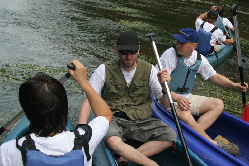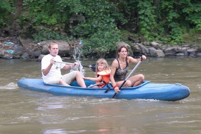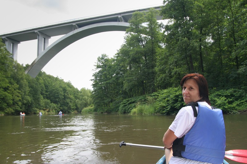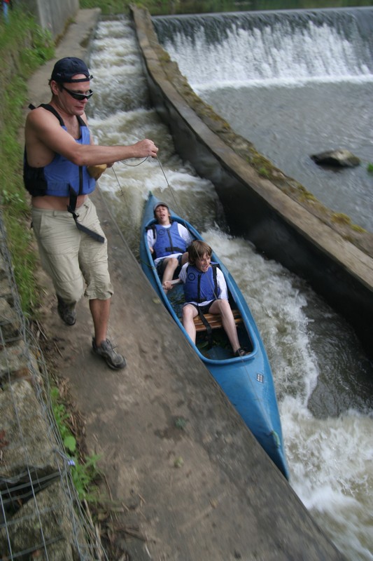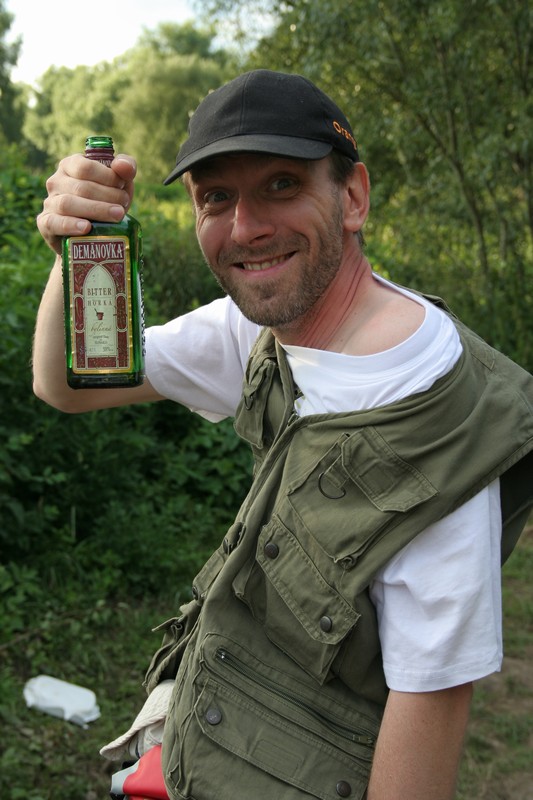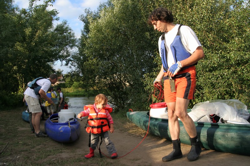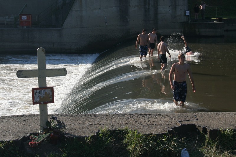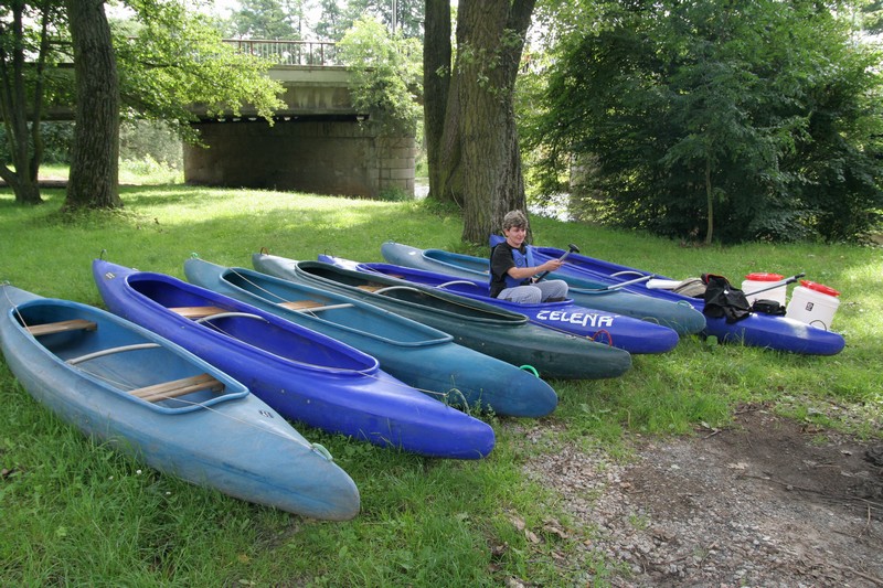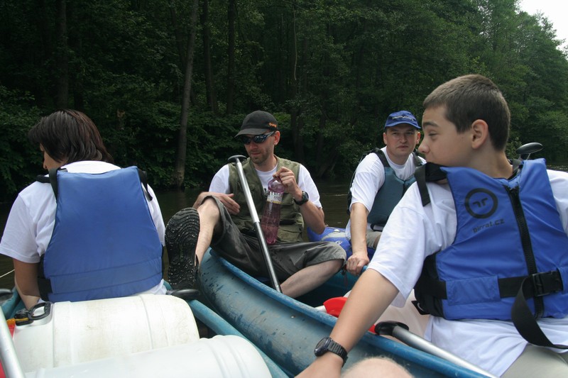 Včerajšia etapa dala skutočne zabrať, o čom svedčilo úmerne neskoré vstávanie. S balením tábora sme začali o pol jedenástej, a už na pravé poludnie oblizla hladinu prvá kánojka. Úsek viedol pokojným korytom rieky s jednou športovou perejou, no v tom čase s nižším stupňom vody. Dali sme si pauzu na kamenistom výbežku a nechali sa baviť inštruktorom detských kajakárov. Ten najprv na požiadanie, no neskôr celkom sám, z vlastnej iniciatívy, ako keď páv roztiahne brka aby samičky zaujal, robil eskimácke otočky jednu za druhou, až mu to zaiste muselo vypláchnuť usadené hlieny v dutinách nosných aj čelných. O pol štvrtej sme zastavili v Dubine na obedné občerstvenie v Hospodě u Dvořáků. Pohľad na sympatickú blonďatú roznášačku piva orosil nejeden... pohár so svetlým Gambáčom a ovocné knedlíky tomu dodali exotickú príchuť. O pol siedmej sme zakotvili pred, na prvý pohľad, nesplavným a nebezpečným jezom. Drevený kríž so zašlou fotografiou ženy poriadne zamrazil. O odľahčenie situácie sa postarali miestni borci, ktorí sa bez jediného zaváhania vrhali hlava-nehlava do vodného valca či laškovali na úvrati hrádze. Keď bolo jasné, že sú to čistí blázni, prišiel ich kráľ. Preliezol oplotenie stavadla, vyštveral sa na schátralú budovu vedľa stavadla a z výšky dobrých 10 metrov skákal do temnej vody tesne za mohutné kovové dvere hate. Vyzeralo to, že sledovaním skokov strávime zvyšok večera, no zarazil to Tibor svojim výberom akostného, odrodového i výberového vína, rozlievaného do českého skla. Oheň, pôvodne zápalkami a poctivým papierom neúspešne zapaľovaný, a až pomocou Marekovho mládežníckeho inovatívneho postupu dezodorantom zapálený, plápolal, až sa od neho zore na oblohe červenali. Pol desiatej bol ten pravý čas na opekanie a psychickú podporu miestneho rybára.