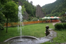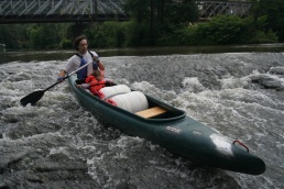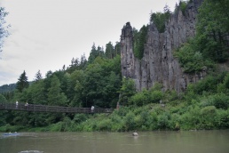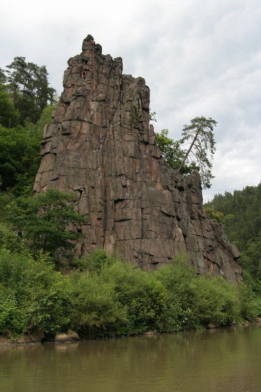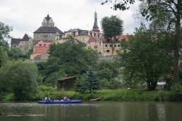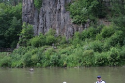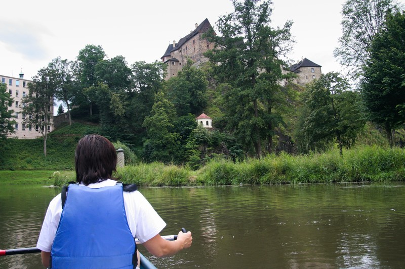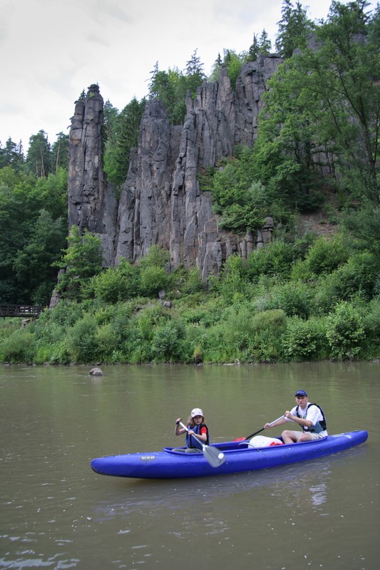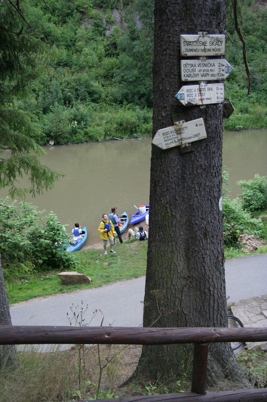O pol deviatej bola polovica chasy na nohách. To preto, že o necelých dvadsať minút odchádzal vlak proti prúdu Ohře do Sokolova, kde malo dôjsť k prevzatiu lodí. A čo staré nevládalo, a čo mladé zutekalo na vzdialenú vlakovú stanicu vo dvojiciach Komando s Jankou, Zdenka so mnou a Didi s Jankou. Väčšina obchodov bola v nedeľu zavretá. Útočisko pred hladom sme našli v kaviarni hotela Globál, komicky postavenej v susedstve s rómskymi spoluobčanmi. Dopriali sme si sýte raňajky a k tomu dvojmo zlatý mok. Pri vykladaní lodí k nám pribehol pán s chlapcom, obaja vodáci, so zdesením v tvári, že im práve neznámi Rómovia ukradli jeden barel kompletne aj s vecami v ňom. Okamžite som spozornel a zrak mi podvedome začal vyhľadávať tmavé pohybujúce sa objekty po okolí. Dva mi našiel na strome, jeden pri moste, v diaľke tri... Čakali sme na zvyšok bohatierov, ktorí autami dorazili až predpoludním. Vzhľadom na to, že bola pred nami ukrutne dlhá etapa, to s časom nevyzeralo dobre. Vyštartovali sme jednotlivo a s väčšími odstupmi, inak by sme zrejme nevyrazili vôbec. Ohře nepatrí medzi náročné. Rieka pokojne tiekla a miestami pripomínala skôr jazero. Oživením bol prejazd popod vysoký most s oblúkovou klenbou a meander okolo malebného historického mesta Loket, ktorý zakončil na prvý pohľad neprejazdný jez s kaskádovo zakriveným profilom. Prví obetní testeri boli mládežníci Viki a Marek, ktorých prekoníčkoval Tibor z brehu. Druhí a zároveň poslední testeri Yanoo a Komando to úspešne splavili bez akejkoľvek podpory. O pár sto metrov ďalej si na nás brúsil svoje kamenné zuby prírodný val s nízkou hladinou vody a s prudkou zmenou smeru prúdu pod ním. V nevýhode boli ťažšie váhové aj slabšie silové kategórie posádok, ktoré sa dostali do pasce tohto zubatého lovca. O štvrtej, čiastočne hladní a vyčerpaní sme zakotvili na verejnom táborisku. Bufetík rýchleho občerstvenia ponúkal len bagety a polotovary. Aj napriek nezdravosti bohatierske brucho príliš nefrflalo a po pive už bolo všetko na poriadku. Hodinová prestávka opäť oddialila príchod do cieľa. O tri štvrte na šesť sme zvolali ďalšiu zhromažďovaciu prestávku pri Svatošských skalách. Po polhodinovom blahodárnom relaxe pri pozorovaní šikovných skalolezcov sme vyrazili. Míňali sme kačice, ktoré to na dnes zabalili a pokojne, bez pohnutia, chrápali na skalách trčiacich z vody. Slnko zašlo za mraky a s tieňom prišla zima. Posledný nesplavný jez dal o pol ôsmej večer poriadne zabrať. Záblesky neskorých lúčov sa opreli do okolia a Demänovka do vysmädnutých pier. Až o hodinu neskôr zašušťal prvý zips na vchode do stanu a uvoľnil tak cestu k vytúženému odpočinku. Nie však nadlho - veď kto by odolal večerným potulkám po Karlovarských uličkách, s vábivými svetelnými reklamami na originál Becherovku, všadeprítomnými plnenými kúpeľnými oplátkami, 44. filmovým festivalom, Dvořákovým platanom, ale hlavne podzemnými prameňmi chutí a teplôt od výmyslu sveta.