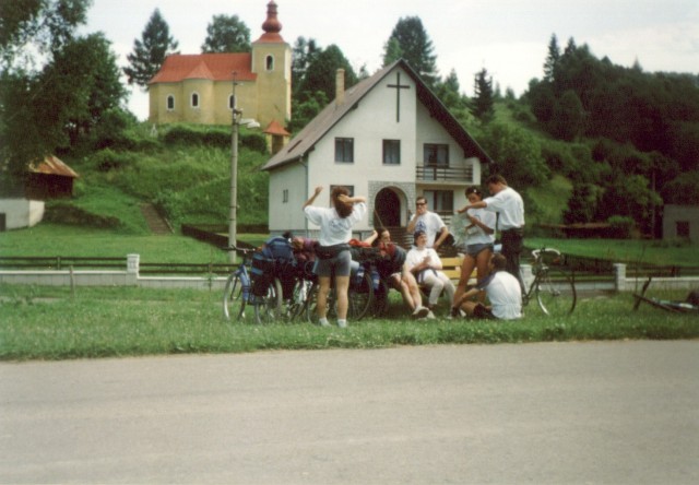 Dano a Zdenka vybavili nocľah. Katolícka fara, teplota vzduchu vo fare cca 24°C. Super! Hneď sa zdvihla nálada. Pán farár kvôli nám zapol radiátory, poskytol nám varnú kanvicu na čaj. Komando natiahol svoj špagát, ktorým si vždy uväzoval ruksak o nosič bicykla, pozdĺž chodby, aby sme si na tom usušili veci. Počas jedenia Reno hral na klavíri (fakt pekne). |