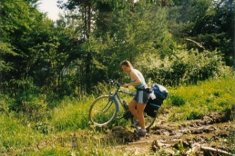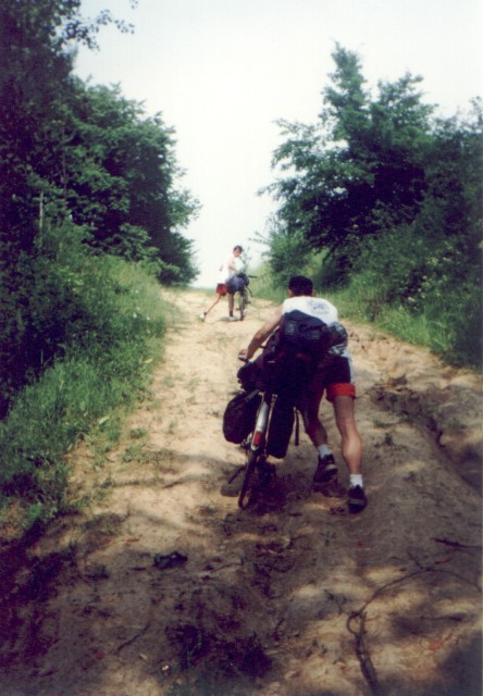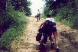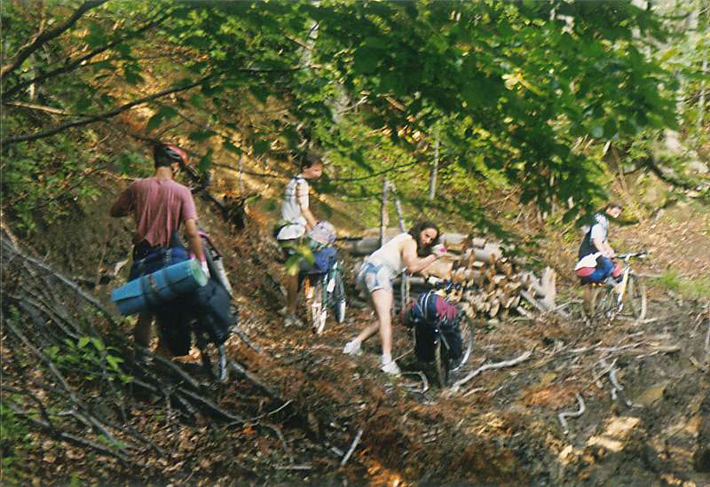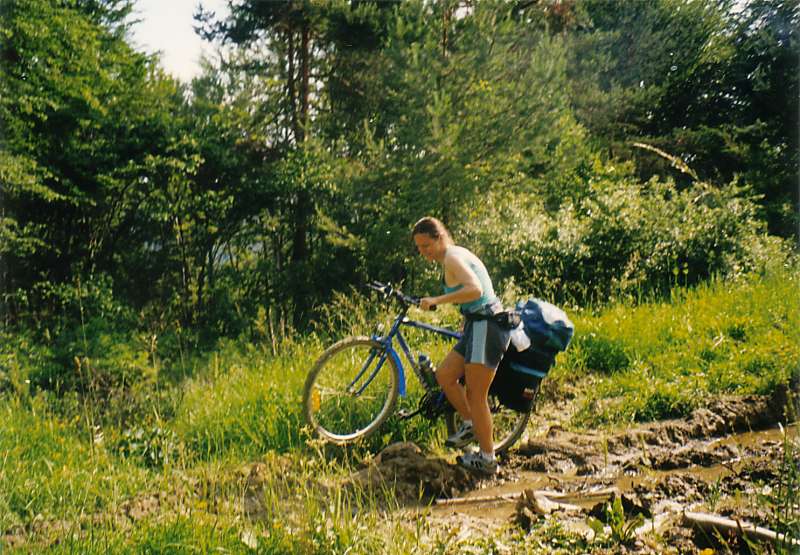 Oddych po stupáku (609 m.n.m.). Končí asfaltka. Dano spieva: „Někde v dálce cesty končí…“. Začína druhé prerážanie. Tentokrát nie harmančeky a obilie, ale blato a kaluže. Komando: „Vždy som si chcel vyskúšať Camel tropic, ale nie na bicykli.“ Trasa bola ťažko schodná peši a nieto ešte na bicykloch.