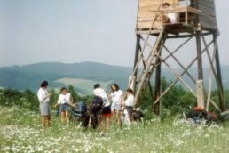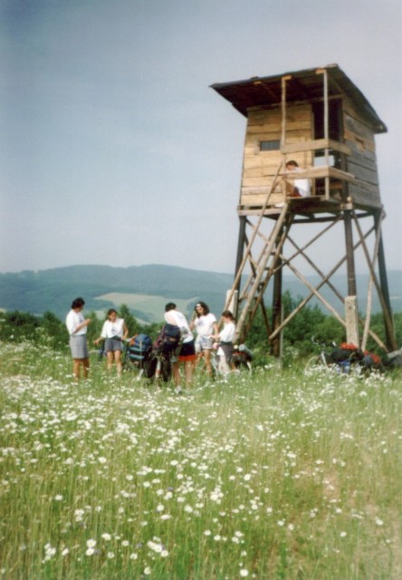 Celí spotení sme prišli k vyhliadkovej veži. Je zavreté. Zavreli o 17:30 a v pondelok je zavreté celý deň. Vstupné 8,- Sk. Ešte počkáme ostatných bohatierov, aby si ten stupák tiež vyšľapali. Na ceste späť: max=67km/h.