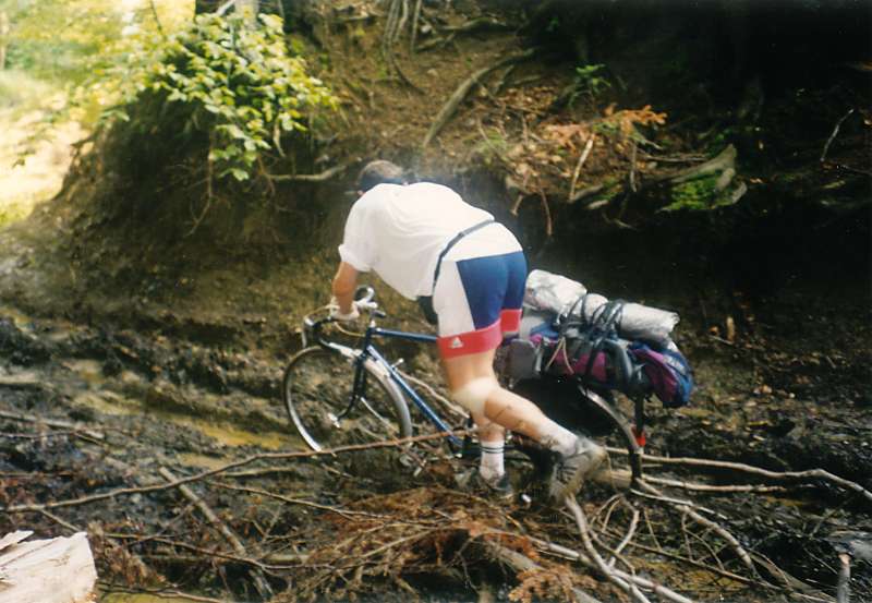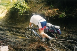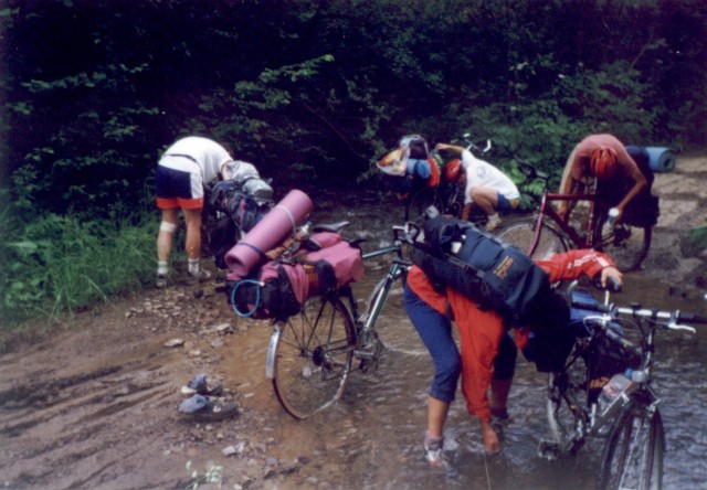 Umývame si bicykle od blata v jednom potoku, čo križuje cestu. Koniec prerážania (cca 2,5km/1h 12min).