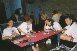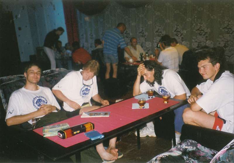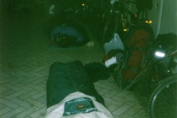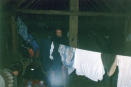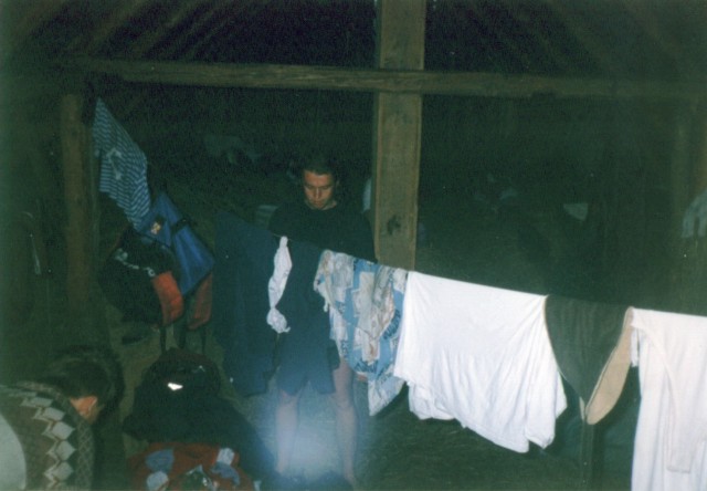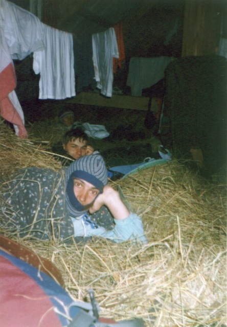 Prišiel chvost. Celý. Asi štyria išli zháňať nocľah, myslím, že Reno, Emo, Zdenka a Komando. Oproti tej zastávke bol dosť veľký hotel, ale nemal zmenáreň. Najbližšia zmenáreň bola vzdialená 50 km. Ale aspoň bolo v recepčnej sále teplo. Asi o hodinu sa vrátili ostatní, že vybavili nocľah v stodole – 3 zlote/osobu/noc. Dobicyklovali sme do tej maštale, rozbalili caky-paky, spacáky, aby sme si zdriemli. V tej stodole bol veľký prievan. Bolo ho trocha cítiť aj cez spacák. Komando vymyslel zlepšovák – zahrabať sa so spacákom pod slamu. |
