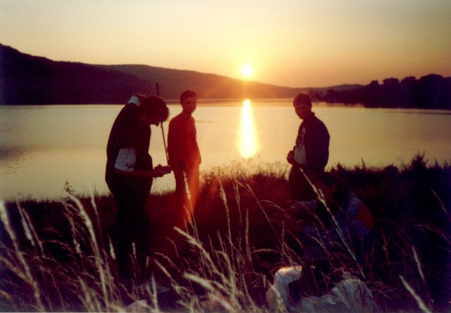 Usadili sme sa. Hurááá… S Danom sme sa hodili do Domaše. Bola veľmi slaná – z nášho potu. Preplávali sme asi 7 metrov a rýchlo ku brehu. Bola príliš čerstvá. Vraj sme odradili Komanda. Predtým váhal, či má ísť do vody a teraz sa už rozhodol, že nie. Dano s Dominom odišli do „Zlatej Rybky“ pre pitnú vodu (3,16km jedným smerom). Slnko krásne svieti, vtáci spievajú, voda dotvára príjemnú atmosféru – ako za odmenu. Škoda, že Zdenka, Anka a Emo sa už odpojili. Urobili sme si zásoby vody, dreva, založili oheň a opiekli špekáčiky na večeru. |