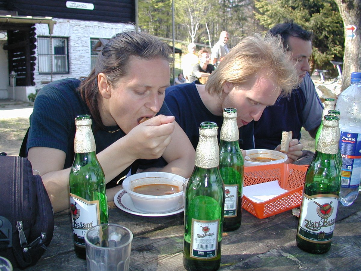 Naše stretnutia prebiehali vcelku zaujímavým spôsobom. V Bratislave sme do rýchliku s pravidelným odchodom 15:50 a niekedy aj pravidelným meškaním nastúpili Komando s Alenkou, Janči a ja. Nutné je podotknúť, že Alenka ako prvoúčastníča vôbec netušila, do čoho ide. Ešte cestou do Piešťan, kde pristúpila Zdenka, sme ju poriadne postrašili. Dobré bolo, keď aj Zdenka potvrdila krutosť tohto 60 kilometrov dlhého pochodu masochistov. Cestou sme zaspomínali na predchádzajúce ročníky a takmer sme vyhlásili pokračovanie minuloročnej súťaže o najväčšiu zbytočnosť, ktorú vlani s prehľadom zvíťazil Komando. Ten minule niesol celých 60 kilákov litrovú fľašu oleja na reťaze motoriek. Zrelým kandidátom bola Zdenka, ktorá so sebou trepala funkčný harddisc o celkovej kapacite 4 gigabajty, čo ako uznáte je naozaj riadna blbosť. Ani sme sa nenazdali a boli sme vo Vrútkach. Tu mal nastúpiť Dancúľ. Nikto ho však z okna nevidel. Škoda, pretože písal email, že sa určite zúčastní a vraj si aj išiel kúpiť nové topánky. Niekde pred Liptovským Mikulášom zrazu vrthol do kupé. Doteraz sme nepochopili, ako, kde a kedy sa mu podarilo nastúpiť, ale vravel, že nastupoval normálne vo Vrútkach. Nezabudol sa pochváliť novými topánkami, ktoré, ako povedal, mali byť zrejme o pol až celé číslo väčšie. V Poprade sme sa najedli a počkali na osobák, ktorý končí v Spišskej Novej Vsi. Tu ma prekvapili popradské hajzelbaby, ktoré po mojom spláchnutí ihneď skontrolovali, či som nechal misu čistú. Pretože som naplnil ich očakávania, dostal som od nich ústnu pochvalu. Vraj by radi mali iba takých "sráčov" ako som ja. V osobáku som naladil rádio na hokejový zápas z majstrovstiev sveta. Záver sme dopozerali v staničnej krčme v Spišskej Novej vsi. Vyhrali sme! Prísediaci pri vedľajšom stole odstáli a odspievali štátnu hymnu a otočili ďalšiu rundu. V Krompachoch sme ako každý rok poslední. Zamykáme dvere a líhame si do pekne vyprdenej a vydýchanej miestnosti.